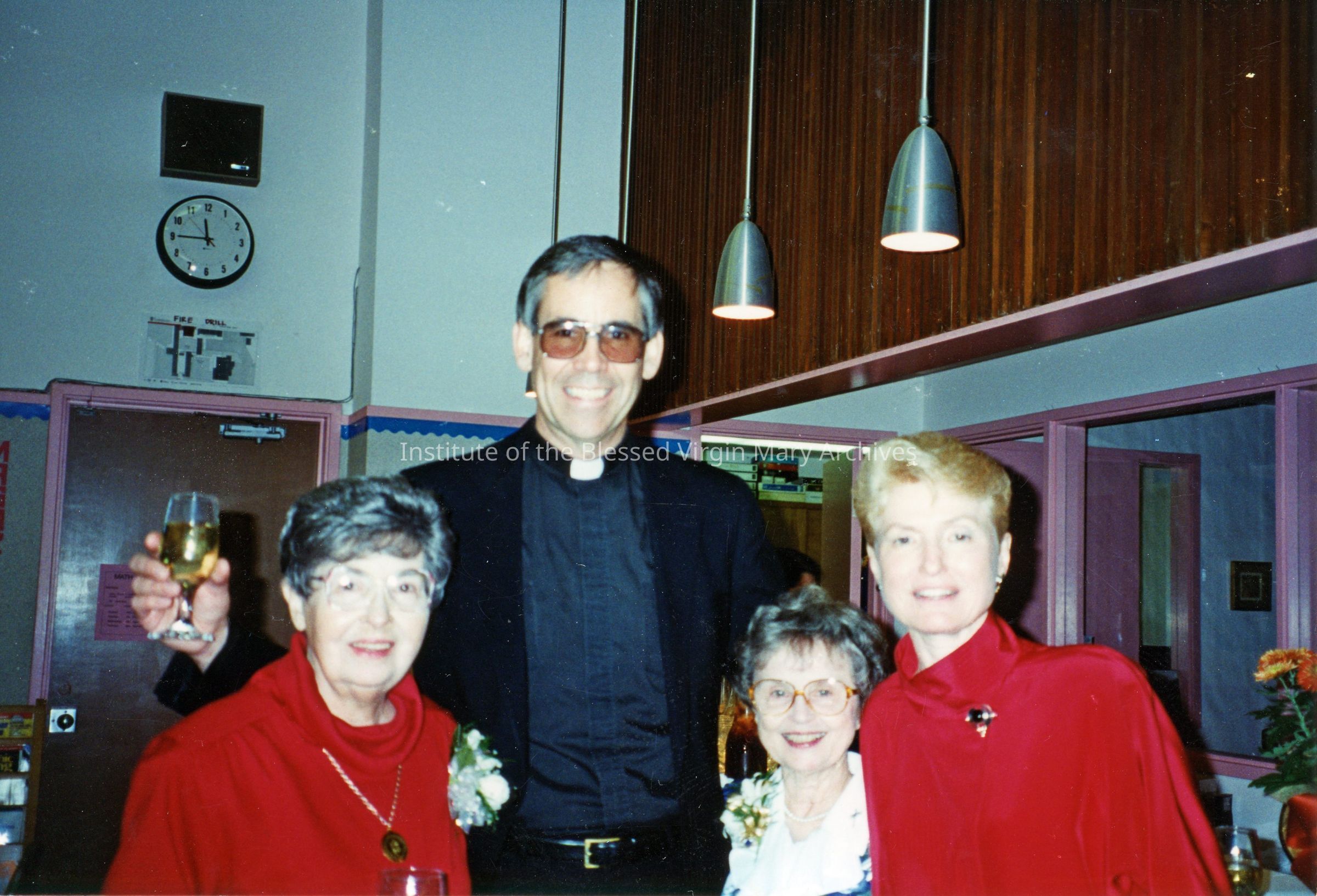 Gathering for Sister Margaret and Sister Francis. From left to right are Sister Margaret (Aileen) O'Connor, Reverend Jerry Ryle, Sister Rita (Francis de Sales) Clarke and Sister Frances (Maria Regina) Bierer. This event commemorated Sister Margaret's 60th Jubilee and Sister Rita's 51st Jubilee. The celebration took place in the library at Loretto High School in Sacramento, California.