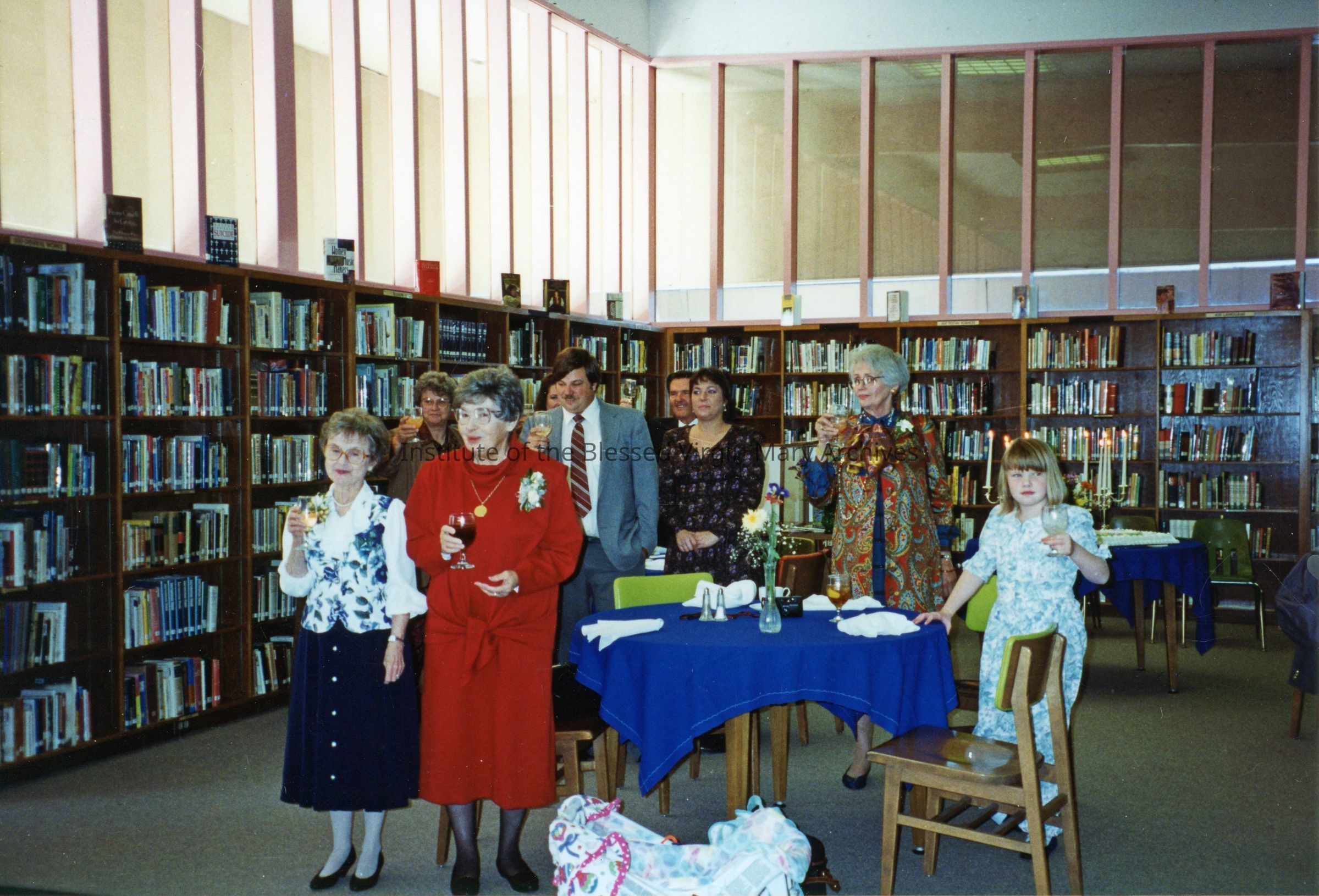 Gathering for Sister Rita (Francis de Sales) Clarke, far left, and Sister Margaret (Aileen) O'Connor, second from left. This event commemorated Sister Margaret's 60th Jubilee and Sister Rita's 51st Jubilee. The celebration took place in the library at Loretto High School in Sacramento, California.