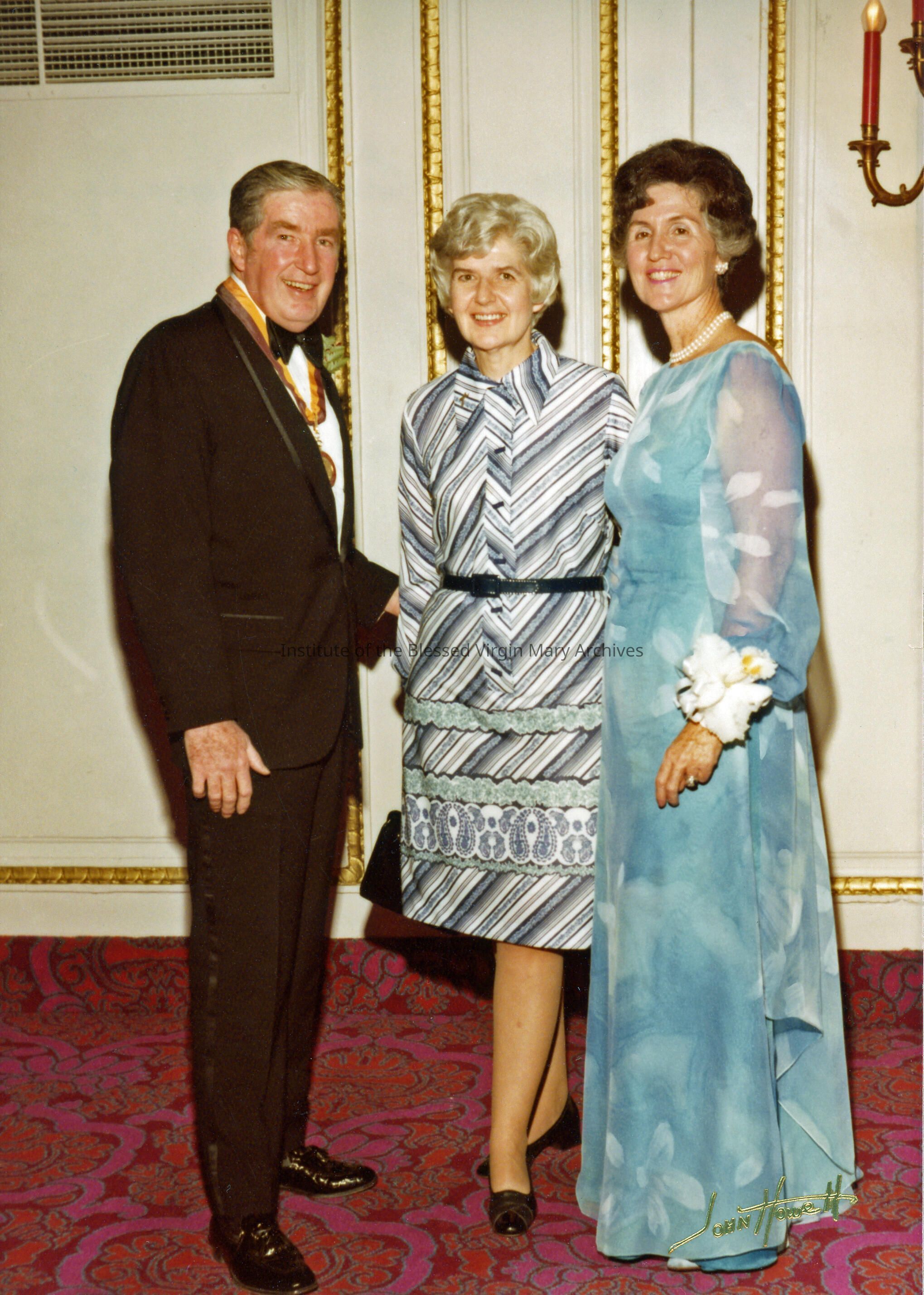 Sister Therese (Peter Claver) Rooney, center, with Mr. And Mrs. John Dowdle. They were attending an awards ceremony at the Congress Plaza Hotel in Chicago. During this time Sister Therese taught at Loretto Academy Woodlawn.