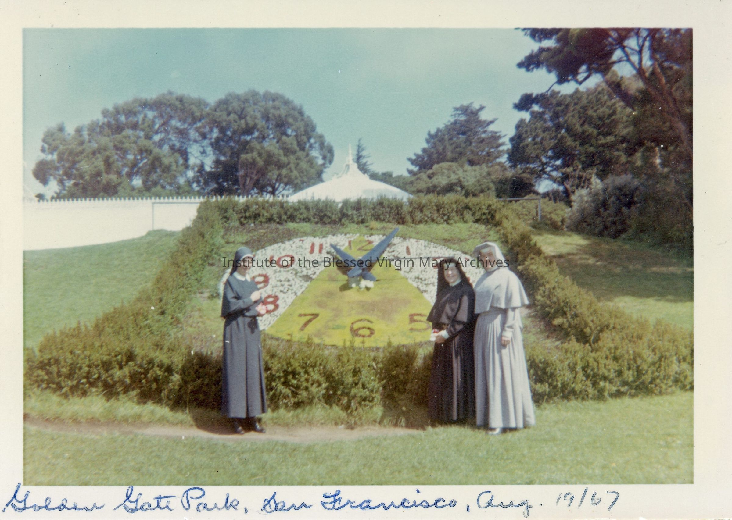 Sisters at Golden Gate Park in San Francisco, California. From left to right are Sister Mary Christine S.C., Sister Maureen (James Ellen) Ryan and unidentified. At this time Sister James Ellen was part of the IBVM community at Our Lady of the Assumption in Carmichael, California.
