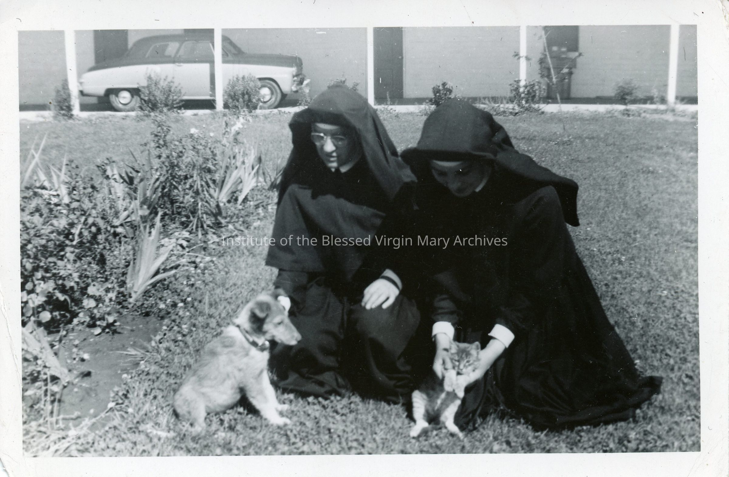 IBVM Sisters at St. Philomene's Parish in Sacramento, California. The image features a puppy and kitten with two sisters.