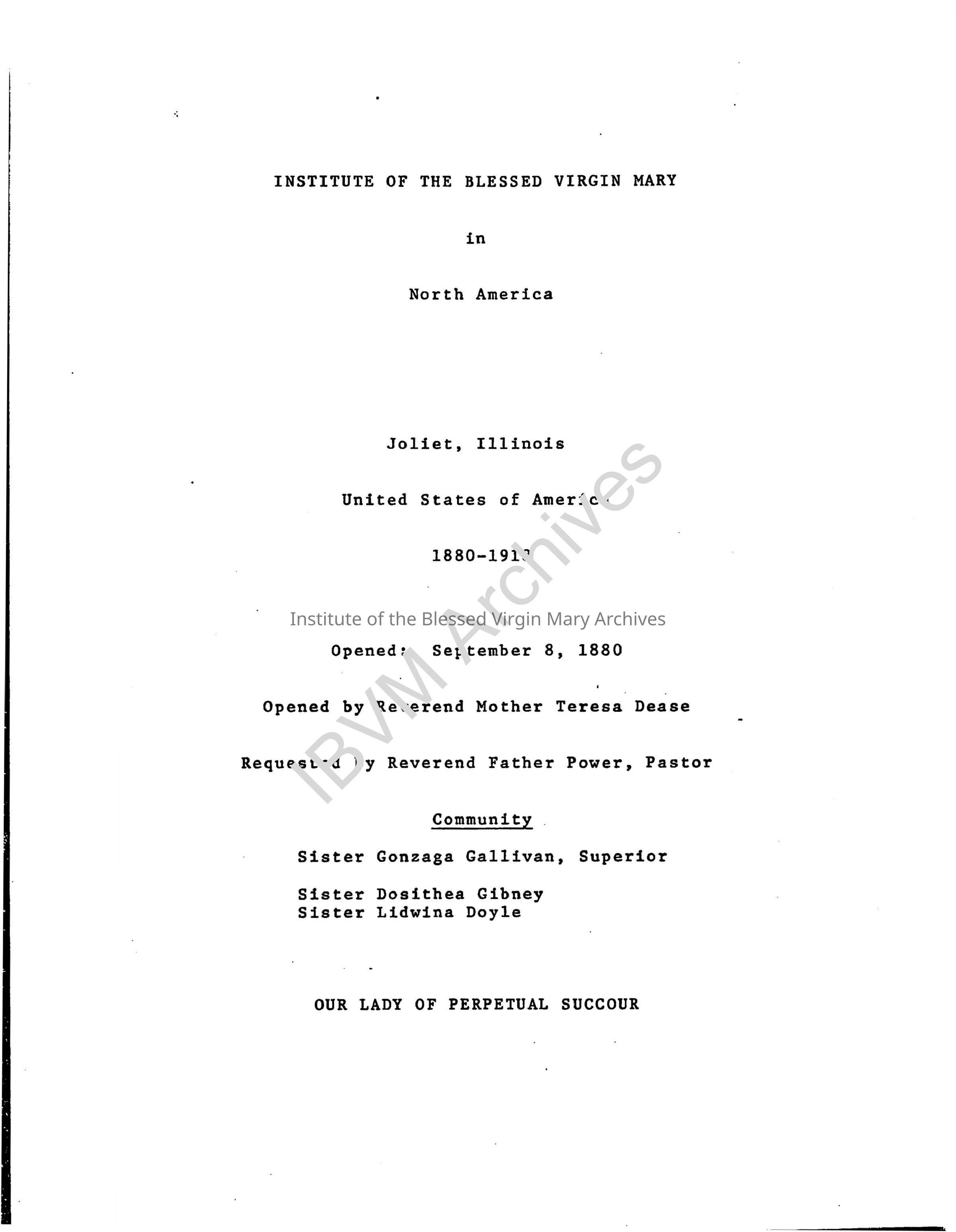 In 1880, the Canadian Mission of the IBVM sent Sisters to establish a presence in Joliet, Illinois. They maintained an education ministry in the community until departing in 1919.Context