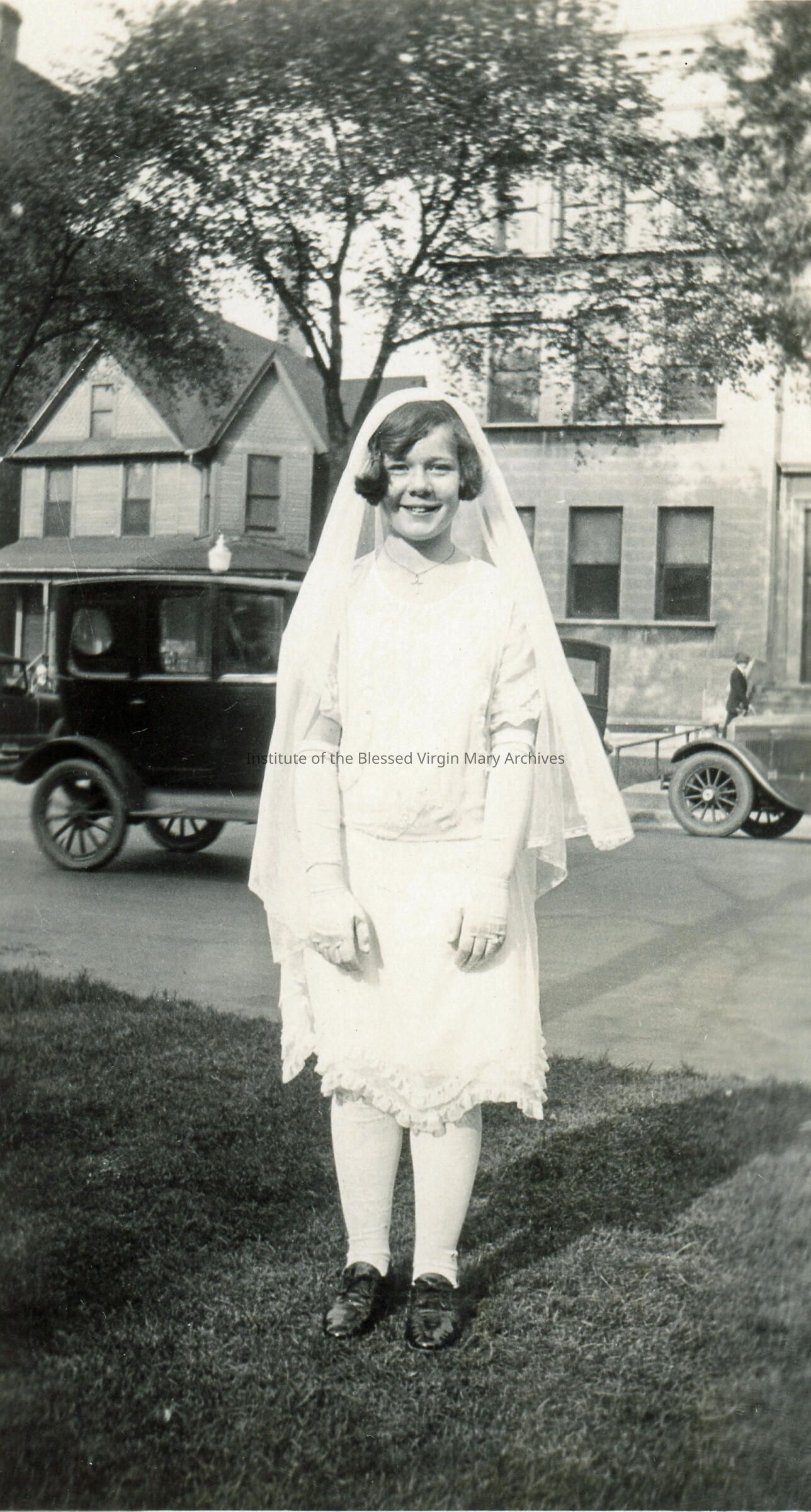 St. Bernard Grammar School student, possibly celebrating her First Communion. The school was located in the 6500 block of Stewart Avenue in Englewood, Chicago.