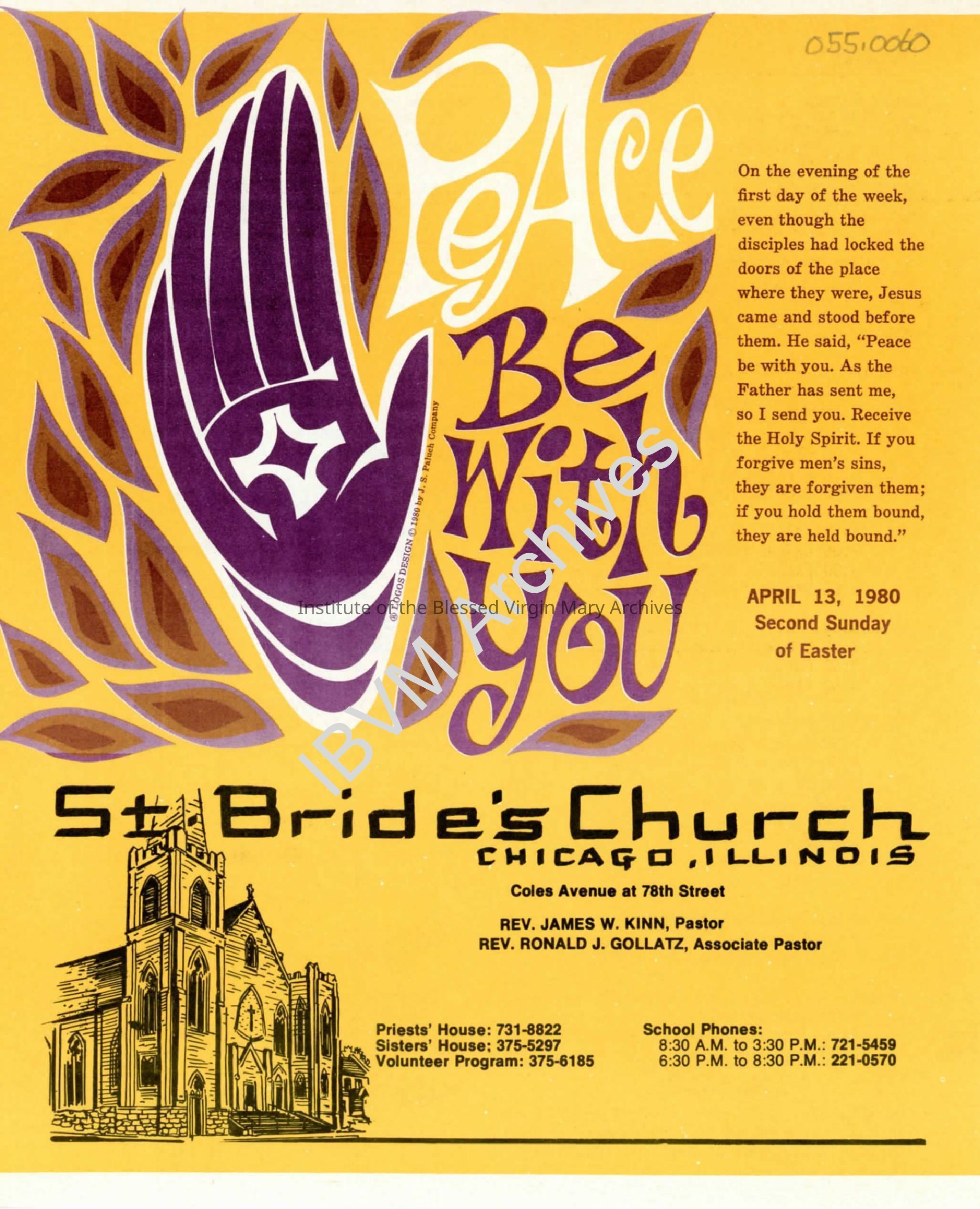 Bulletin for St. Bride's Church in Chicago, Illinois. It contains parish events, Mass times, business advertisements and more. Page three features a special announcement detailing plans for the upcoming one hundredth anniversary of the IBVM in the United States.Context