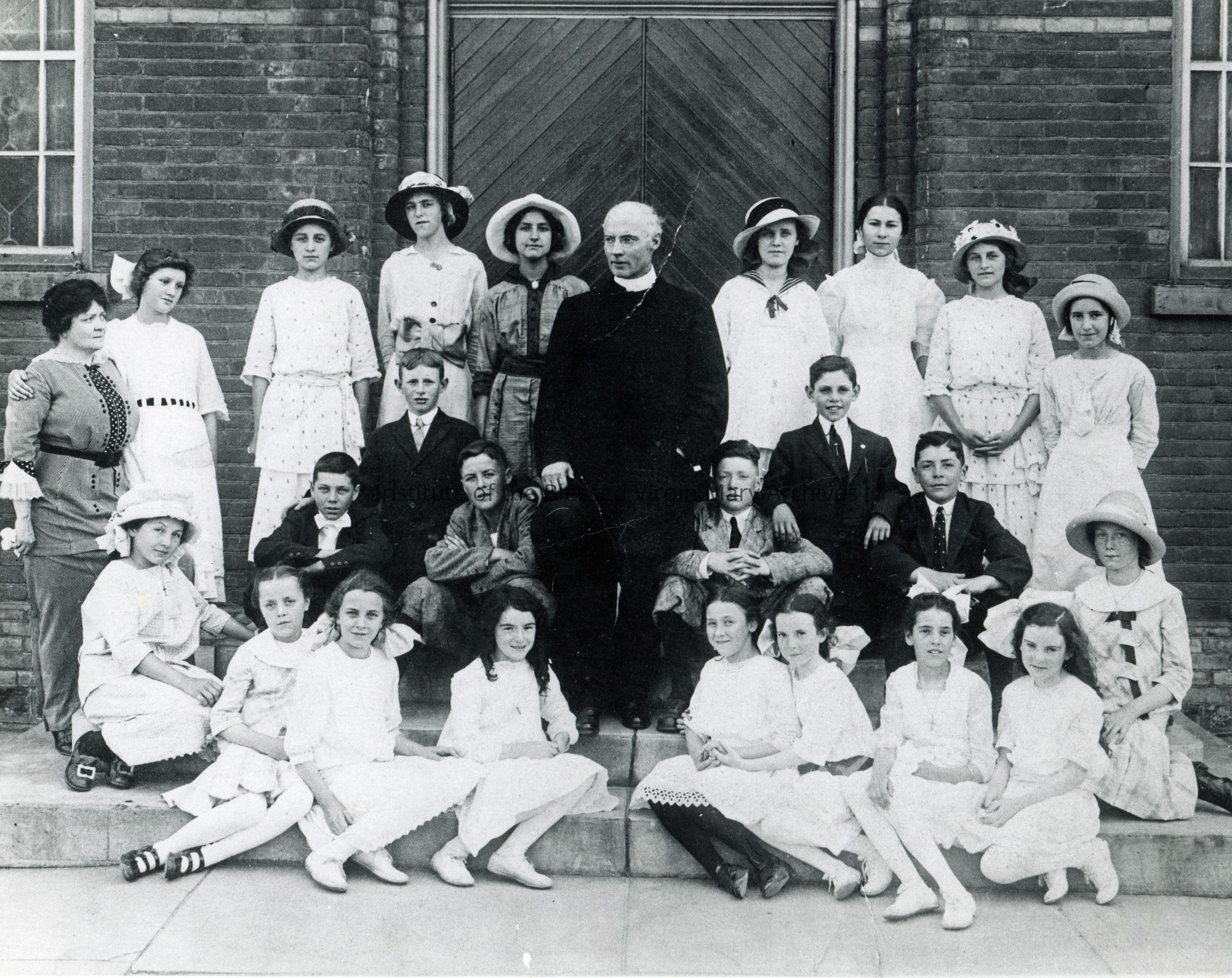 Group photo believed to have been taken at St. Mary's Elementary School in Sault Ste. Marie, Michigan. Mary Porter, later Sister St. Aedan, is third from the right in the top row. Originally located on the north side of Portage Avenue, a new school building was later constructed at 360 Maple Street.