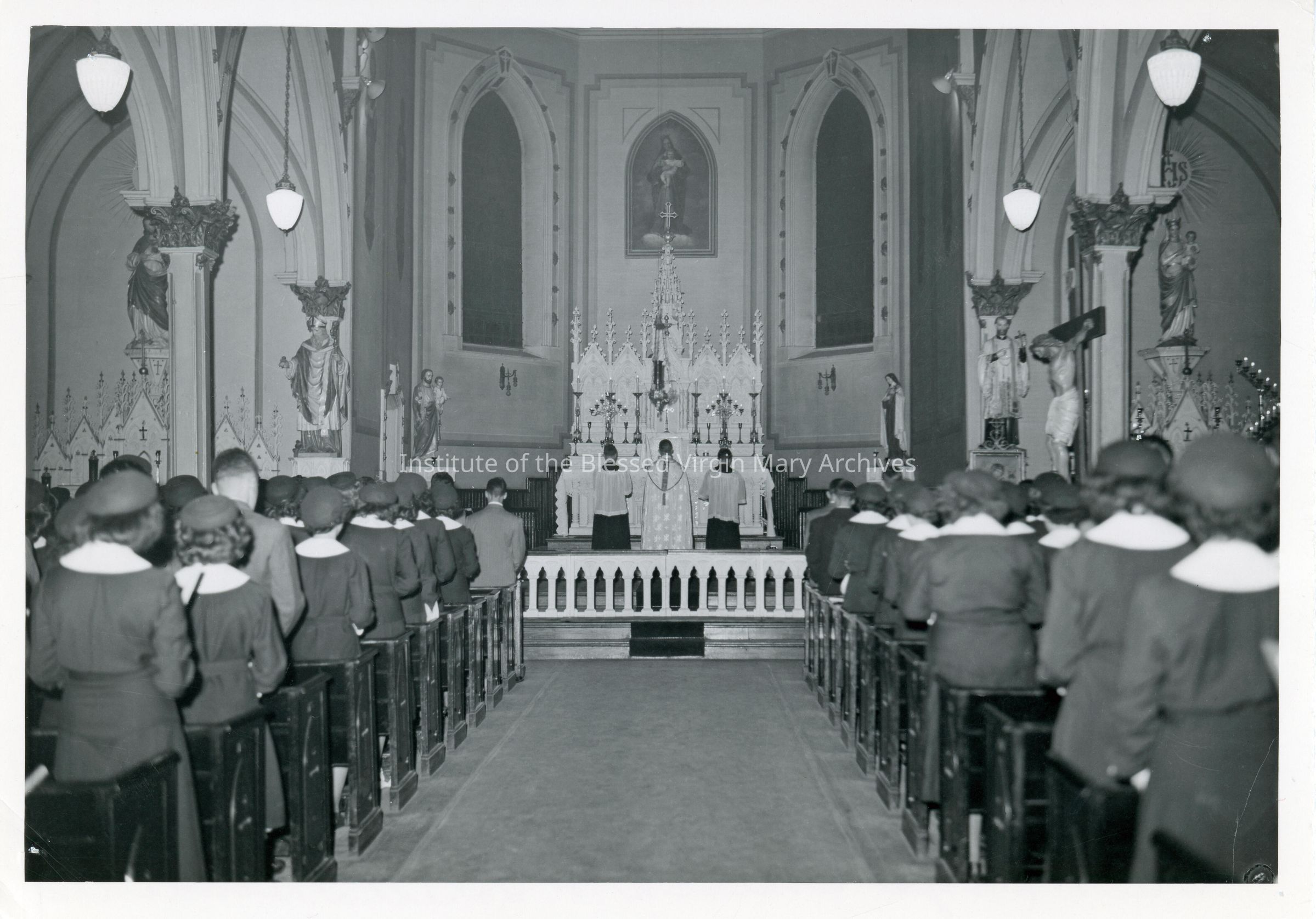 St. Mary's Pro-Cathedral (Holy Name of Mary Catholic Church) located at 320 East Portage Avenue in Sault Ste. Marie, Michigan. This image features Loretto Academy/Loretto High School students participating in the Forty Hours Devotion.