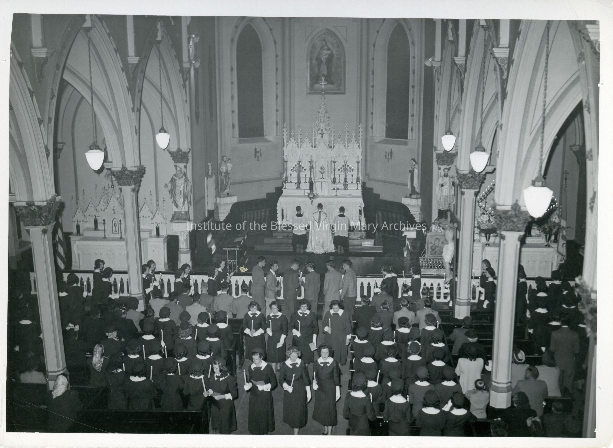 St. Mary's Pro-Cathedral (Holy Name of Mary Catholic Church) located at 320 East Portage Avenue in Sault Ste. Marie, Michigan. This image features Loretto Academy/Loretto High School students participating in the Forty Hours Devotion.