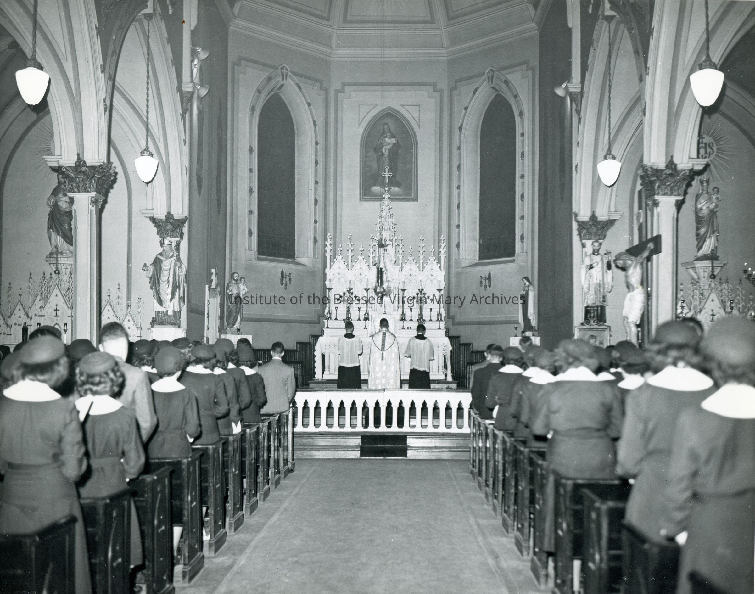 St. Mary's Pro-Cathedral (Holy Name of Mary Catholic Church) located at 320 East Portage Avenue in Sault Ste. Marie, Michigan. This image features Loretto Academy/Loretto High School students participating in the Forty Hours Devotion.
