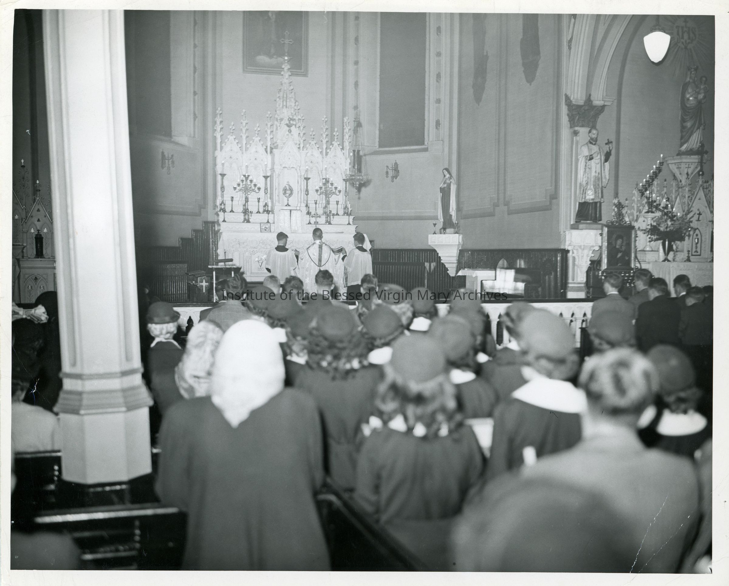St. Mary's Pro-Cathedral (Holy Name of Mary Catholic Church) located at 320 East Portage Avenue in Sault Ste. Marie, Michigan. This image features Loretto Academy/Loretto High School students participating in the Forty Hours Devotion.