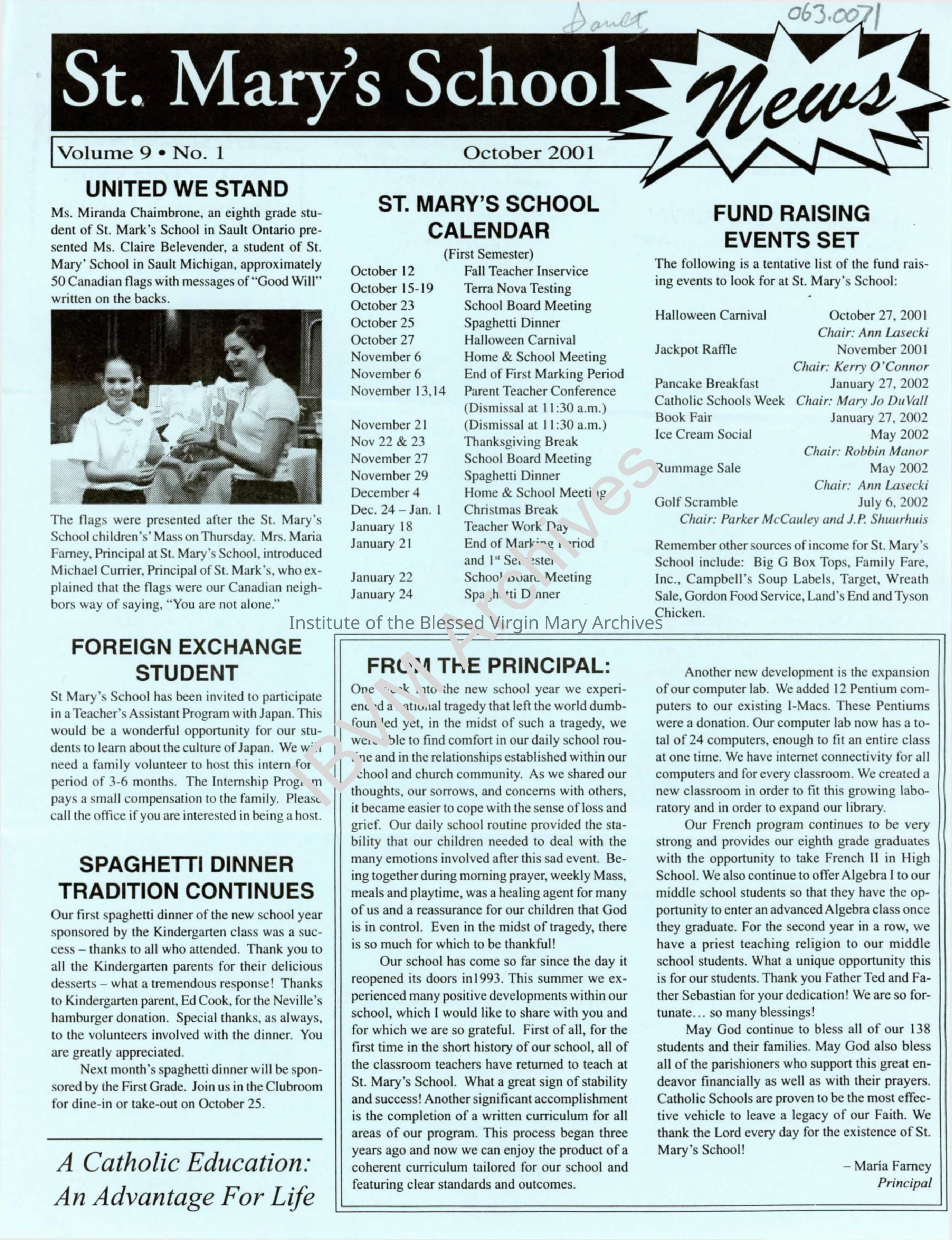Newsletter for St. Mary's School located at 360 Maple Street in Sault Ste. Marie, Michigan. Constructed in 1937, the building was originally home to a Catholic elementary school staffed by the IBVM. The current iteration of the school opened in the mid 1990s.