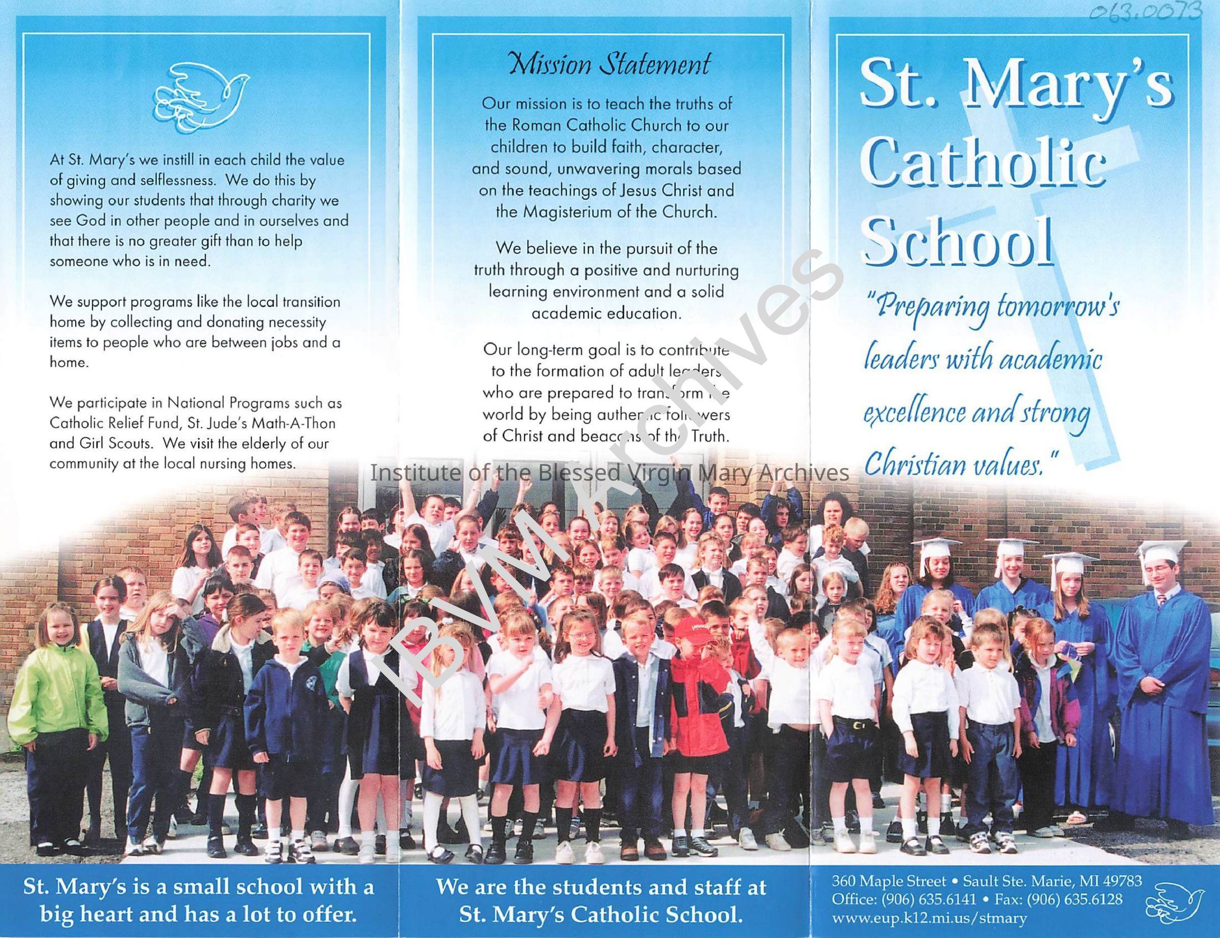 Pamphlet from St. Mary's School located at 360 Maple Street in Sault Ste. Marie, Michigan. Constructed in 1937, the building was originally home to a Catholic elementary school staffed by the IBVM. The current iteration of the school opened in the mid 1990s.
