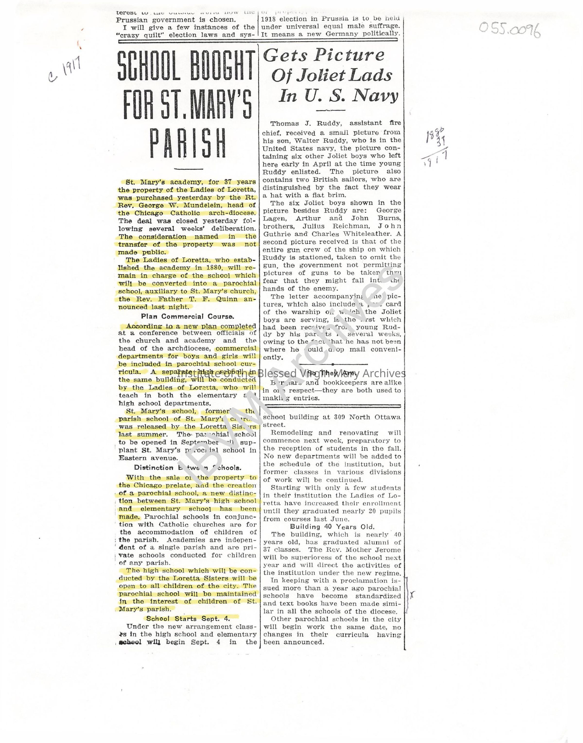 Newspaper article covering the sale of St. Mary's Academy to the Archdioceses of Chicago. It discusses a brief history of the building, future plans and the continued involvement of the IBVM Sisters. Completed in 1883, the academy was located on the southwest corner of Ottawa Street and Cass Avenue.