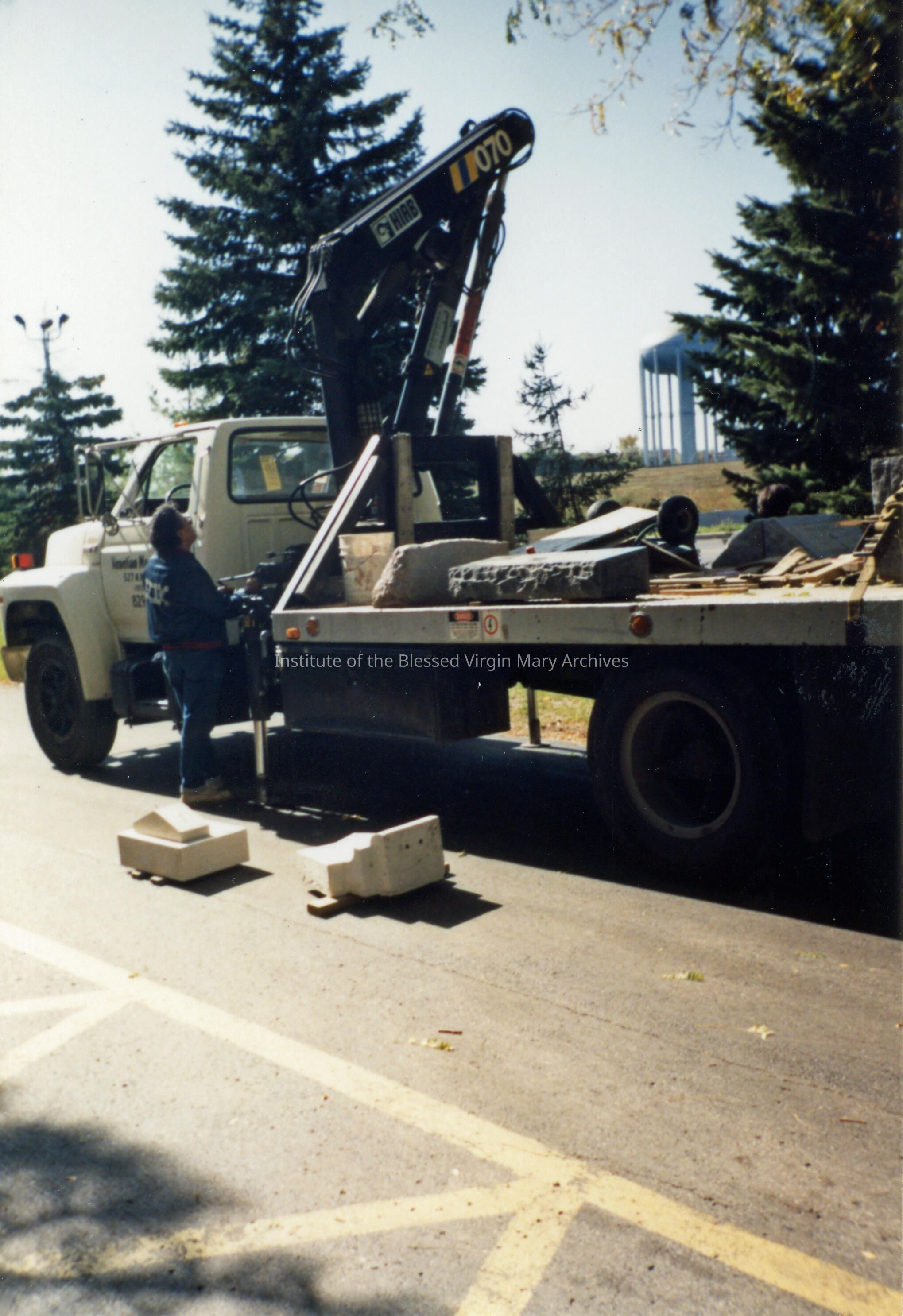 Keystone previously located over the entrance of St. Mary's Academy on the southwest corner of Ottawa Street and Cass Avenue in Joliet, Illinois. At this time it was housed in the IBVM Convent in Wheaton, Illinois. Completed in 1883, St. Mary's Academy was demolished in 1959 after its condition had deteriorated.