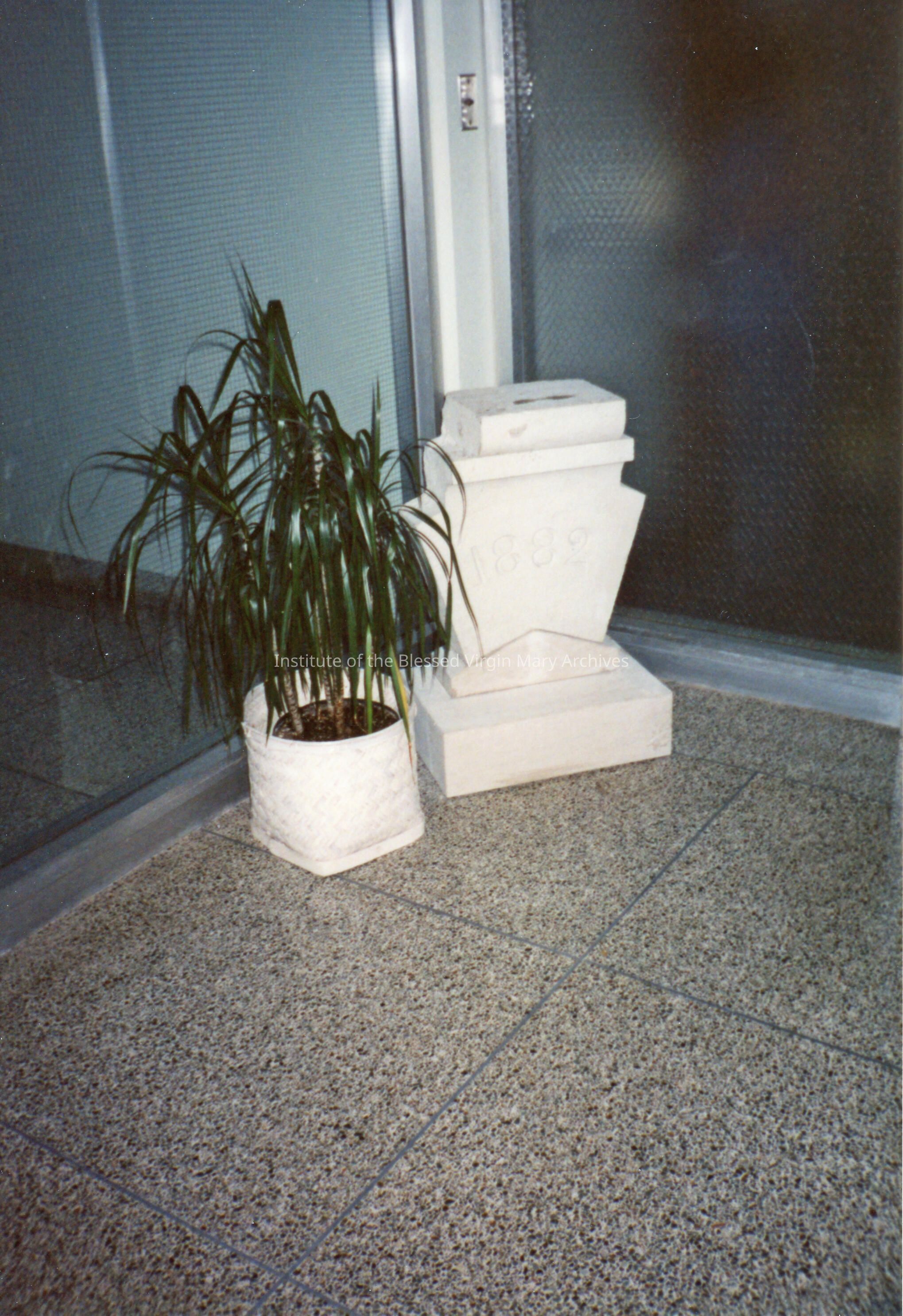 Keystone previously located over the entrance of St. Mary's Academy on the southwest corner of Ottawa Street and Cass Avenue in Joliet, Illinois. At this time it was housed in the IBVM Convent in Wheaton, Illinois. Completed in 1883, St. Mary's Academy was demolished in 1959 after its condition had deteriorated.