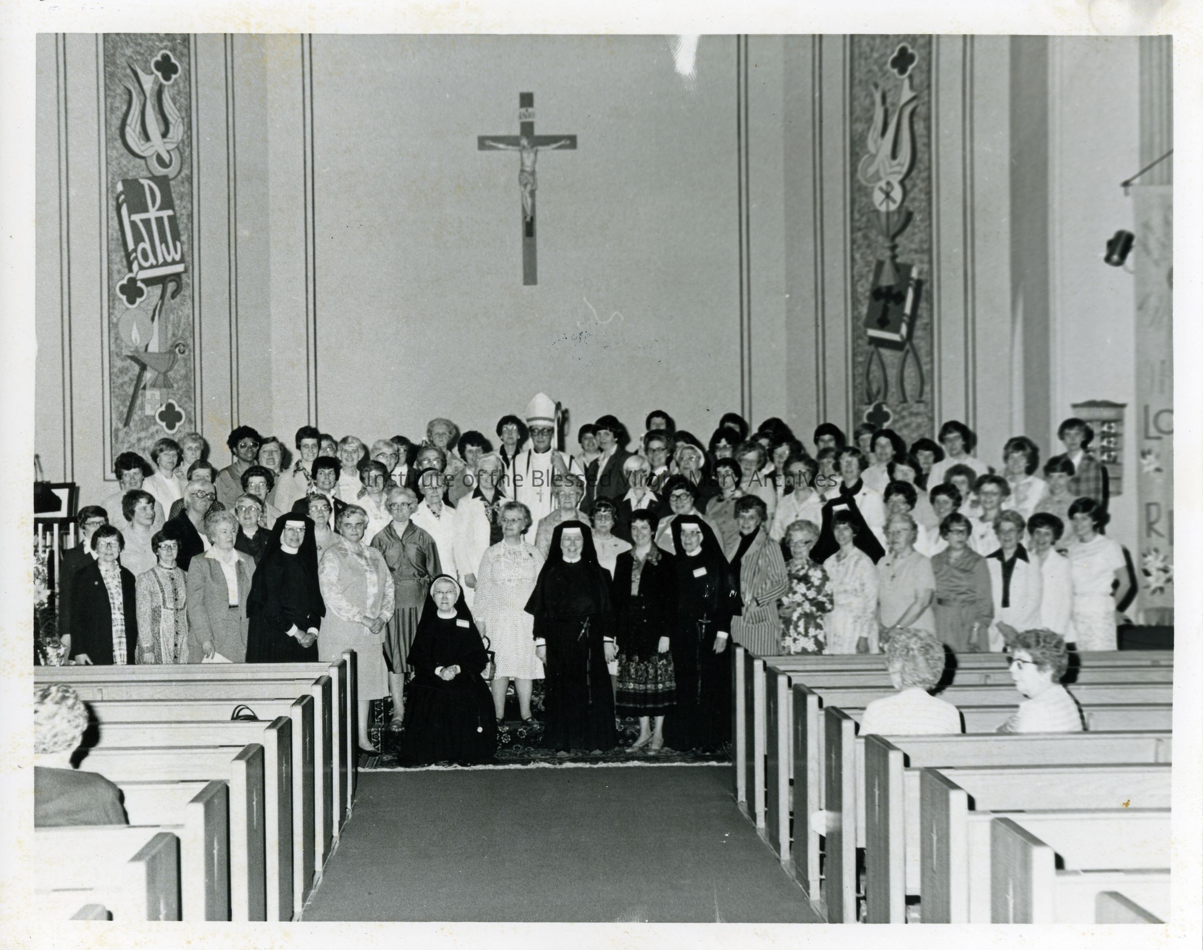Gathering at St. Mary's Carmelite Church located at 113 North Ottawa Street in Joliet, Illinois. Held on April 20th, 1980, this event commemorated the one hundredth anniversary of the IBVM in the United States. The church itself opened for worship in 1879 and was originally known as St. Mary's Church. It was closed by the Dioceses of Joliet in 1991.