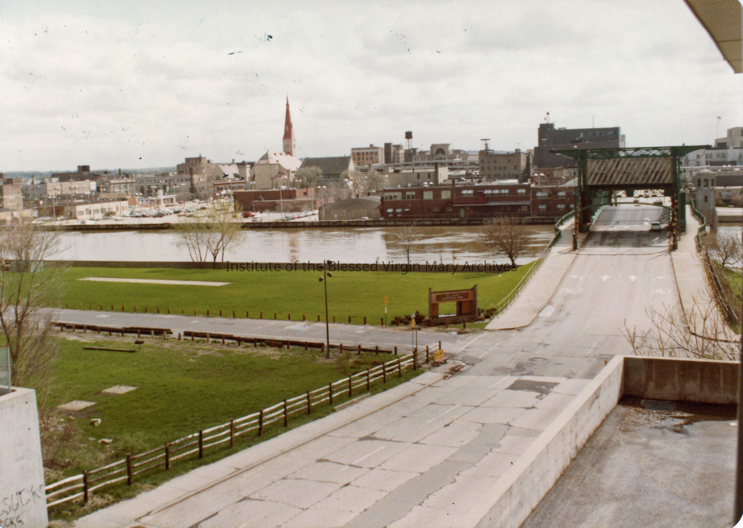 Looking east across the Des Plaines River in Joliet, Illinois. The image was taken near Joliet Catholic High School located at 29 North Broadway Street. In the distance St. Mary's Church (later St. Mary's Carmelite) is visible. Located at 113 North Ottawa Street, the church opened for worship in 1879 and was closed by the Dioceses of Joliet in 1991. In 1881, the IBVM Sisters moved from St. Patrick's to St. Mary's and resided there until a new convent was completed in 1883. The Sisters also taught at the parish school until 1919. The Jefferson Street Bridge is on the right.