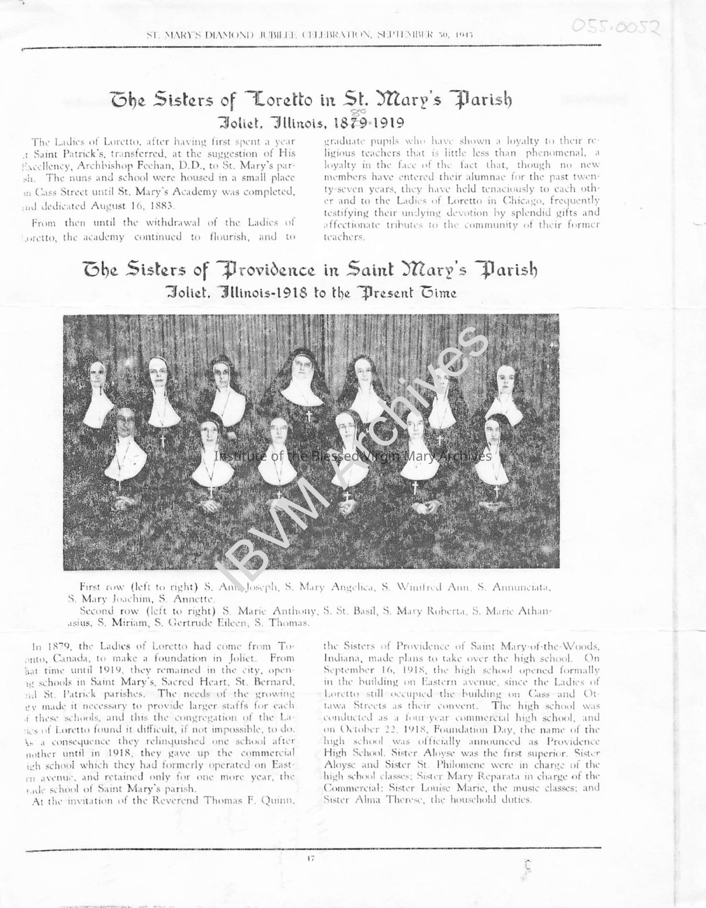 History of St. Mary's Parish produced for the church's diamond jubilee. It discusses the Sisters of Loretto and the Sisters of Providence, focusing on the role each community played in Joliet's early Catholic education system. Included are lists of religious vocations from St. Mary's Parish and superiors at St. Mary's School. St. Mary's Academy is also briefly referenced. The church opened for worship in 1879 and was closed by the Dioceses of Joliet in 1991.