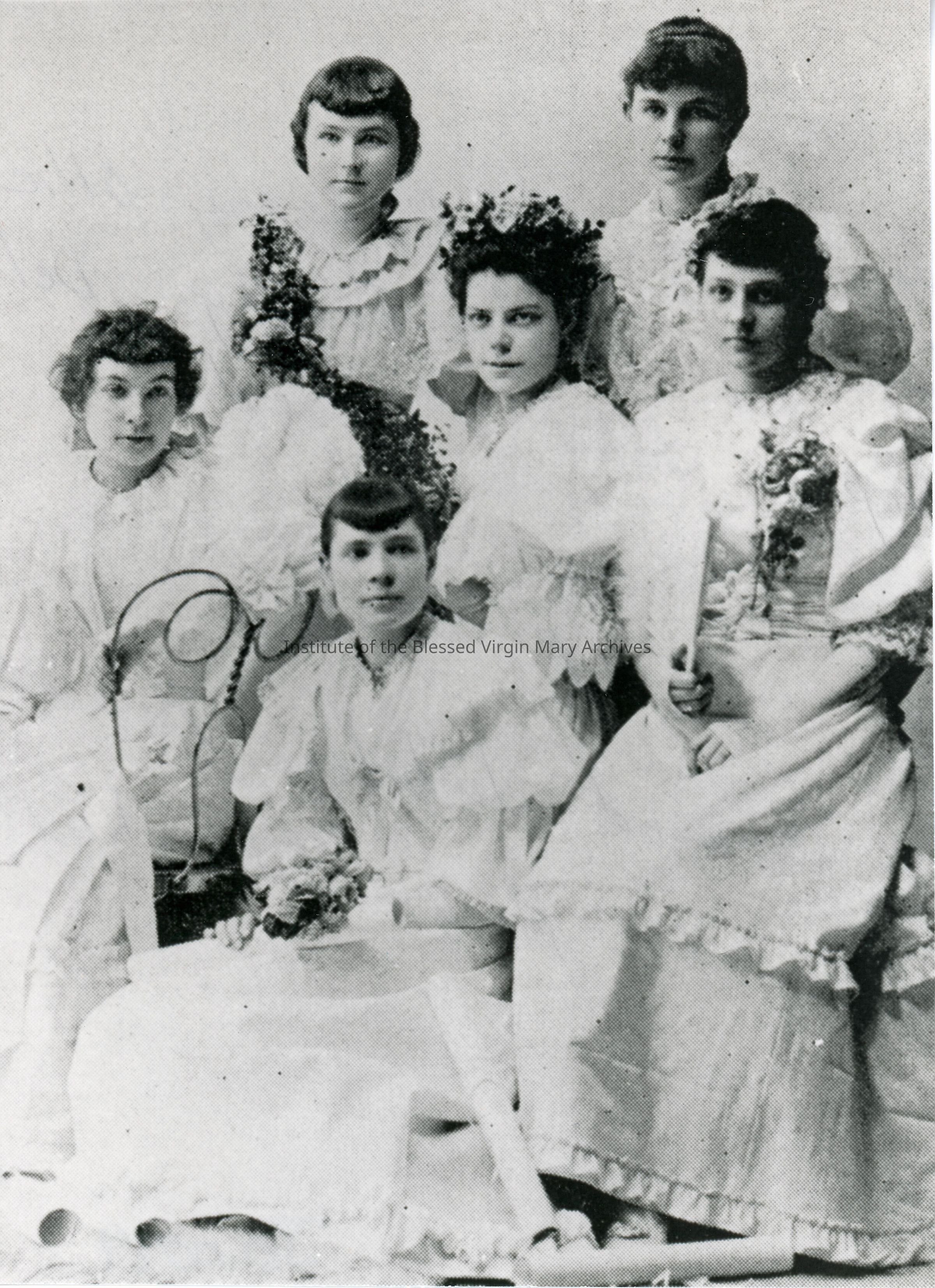 Students from the first graduating class of St. Mary's Parochial School located at 309 North Eastern Avenue in Joliet, Illinois. Present, in an unknown order, are Cele Murray, Margaret McGarry, Ollie Hennessy, Sadie Toughy, Delia Murphy and Julia O'Connell.