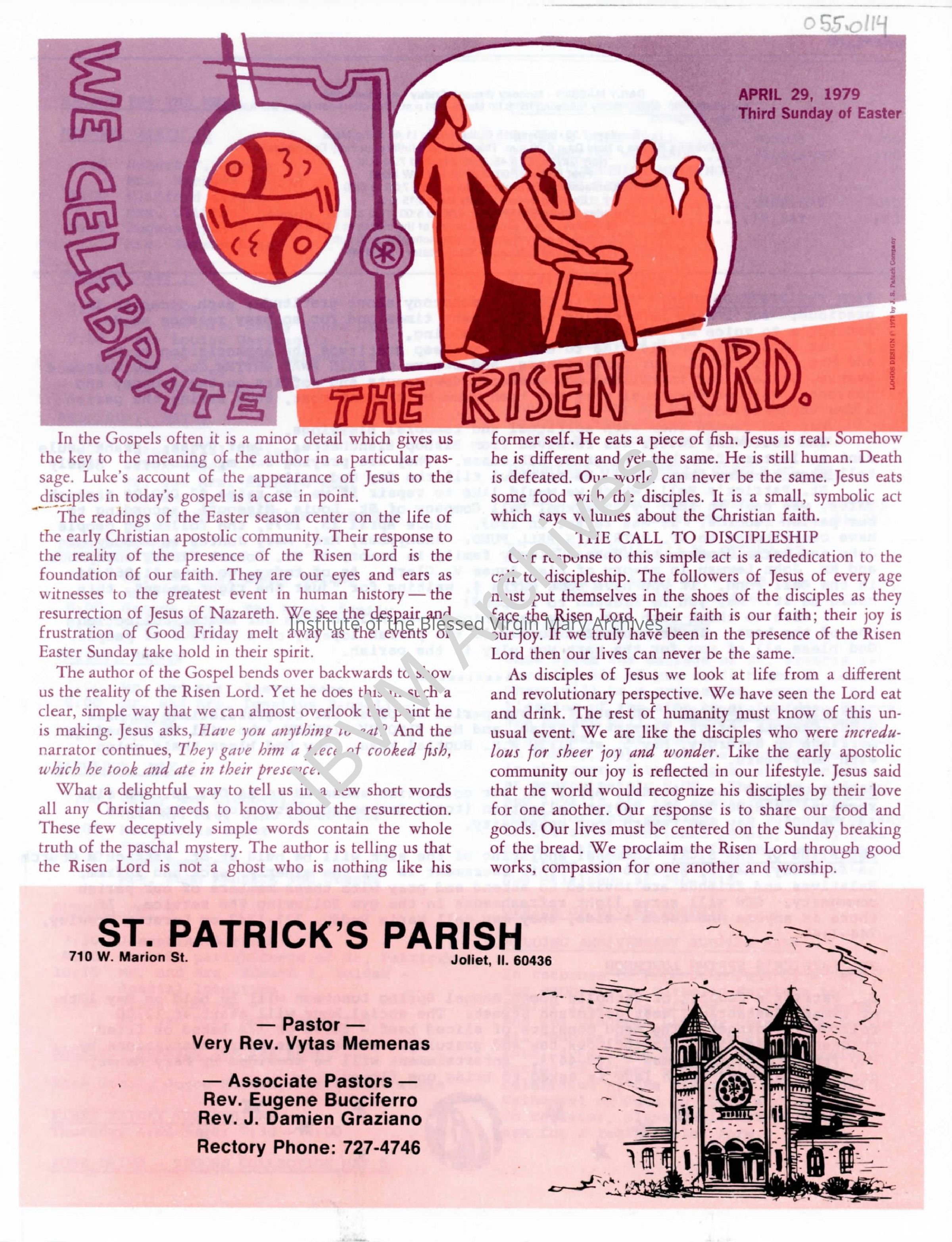 Bulletin for St. Patrick's Church in Joliet. It contains information on Masses, announcements, meetings, upcoming events, business advertisements and more. After their arrival in Joliet in 1880, the IBVM Sisters stayed at St. Patrick's for a brief period. They also taught at the parish school until 1914.Context