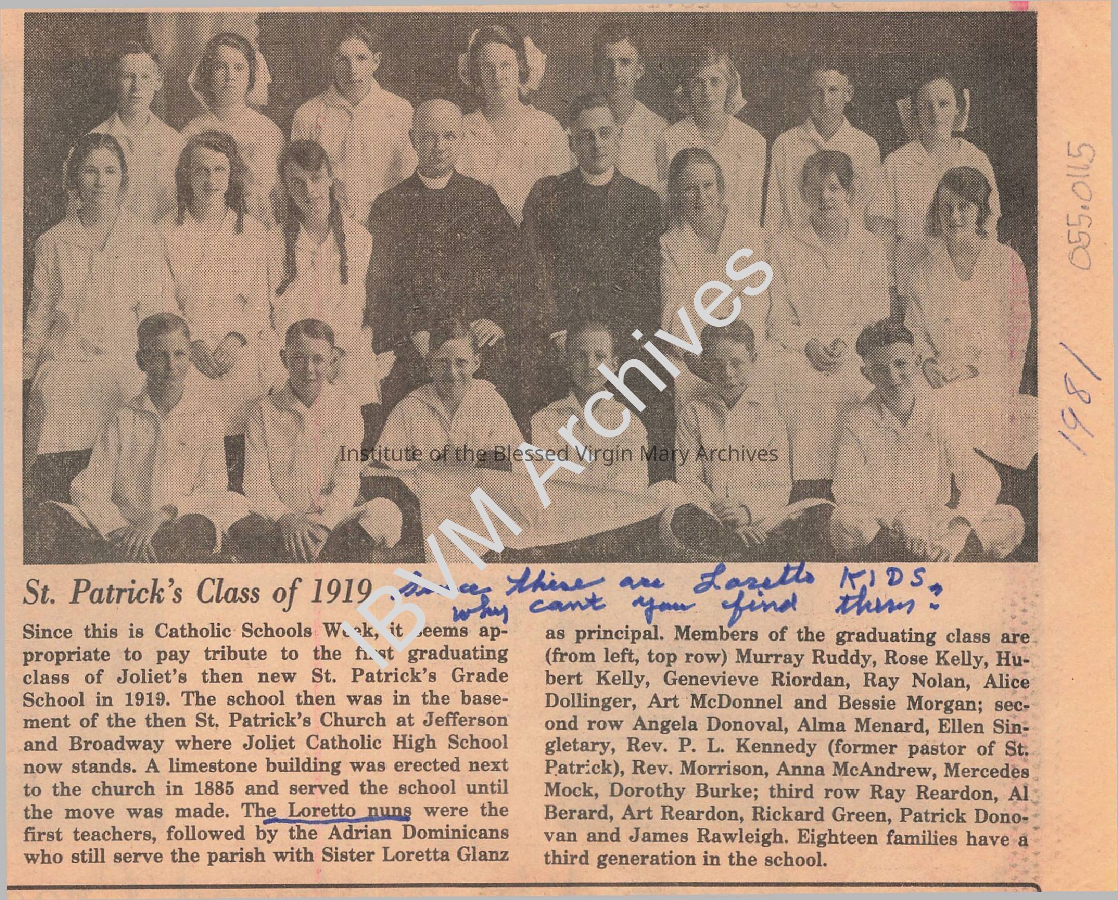 Newspaper article covering Catholic Schools Week in 1981. It features a photo and description of St. Patrick's class of 1919, and briefly mentions the "Loretto Nuns". Upon their arrival in Joliet in 1880, the IBVM Sisters stayed at St. Patrick's and also taught at the parish school until 1914.Context
