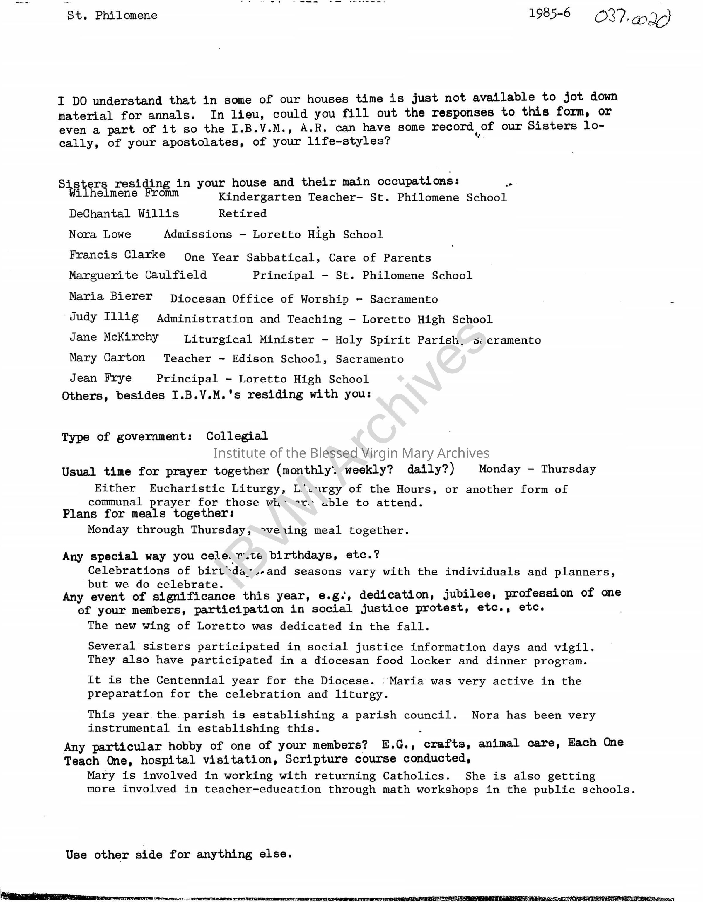 St. Philomene Convent Information, 1985 - 1986Entry/Object ID