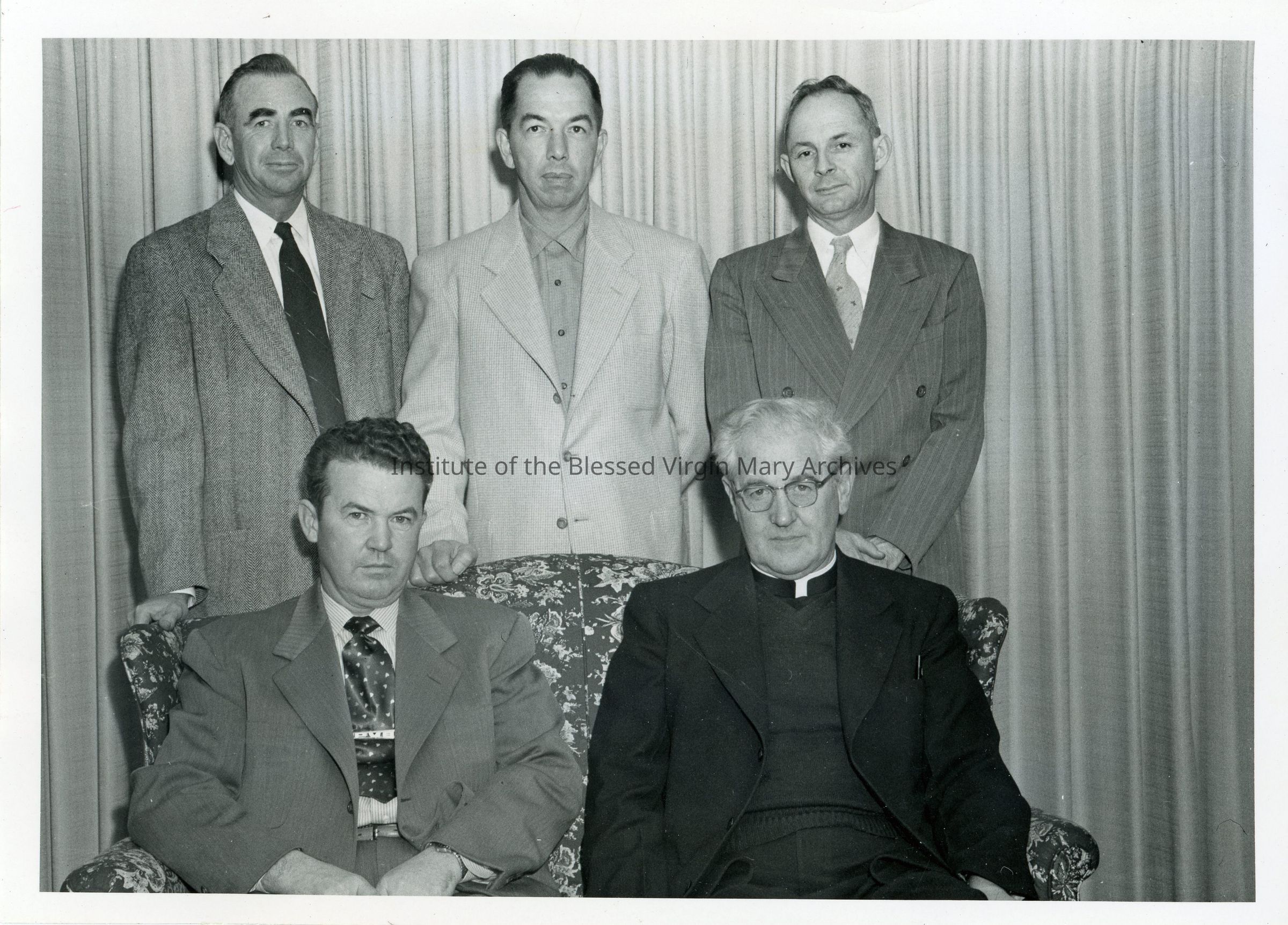 St. Philomene's Church located at 2428 Bell Street in Sacramento, California. This image features Father Daniel Twomey with four unidentified men.