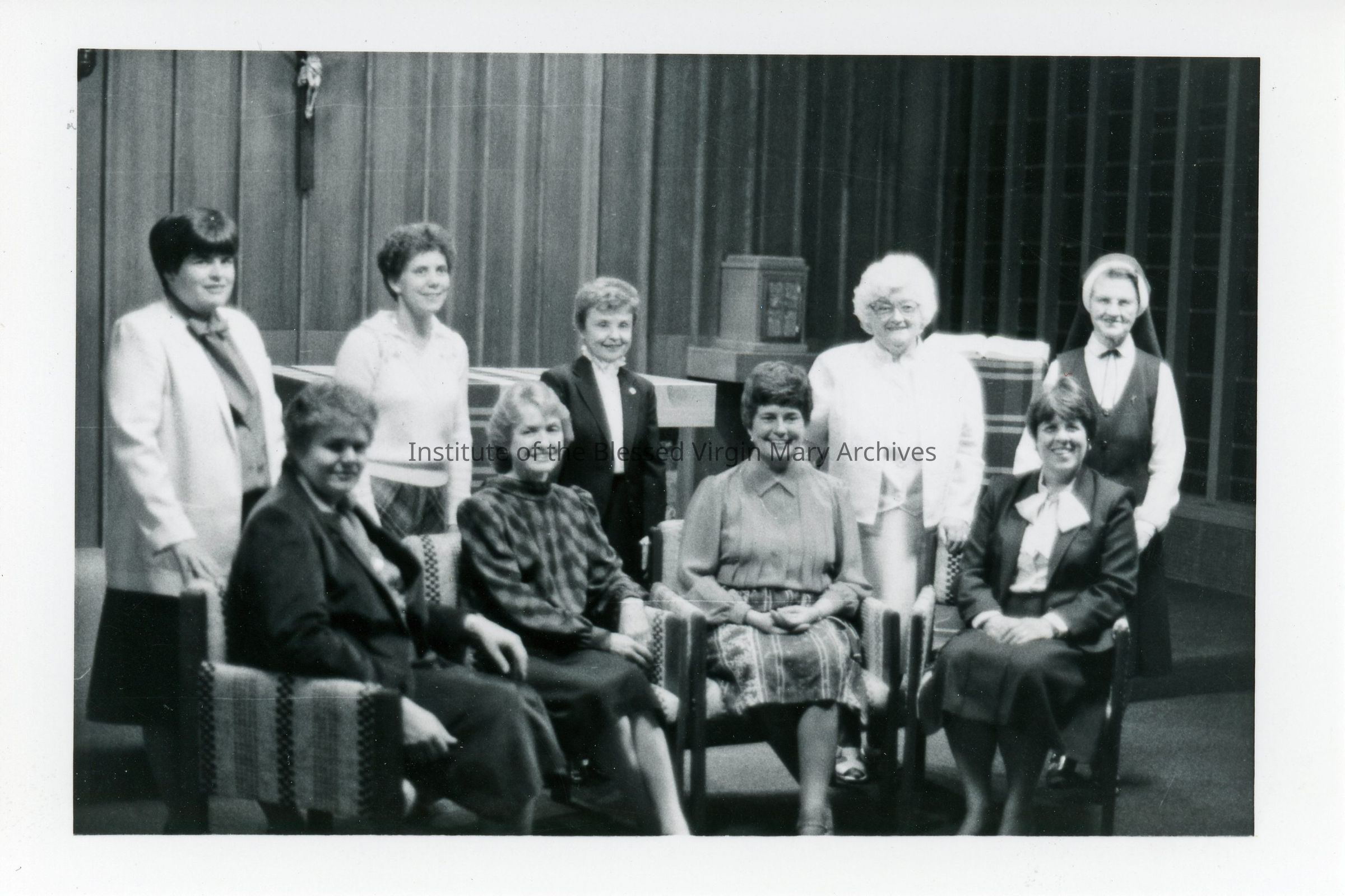 IBVM Sisters from the community at St. Philomene's in Sacramento, California. Standing, from left to right, are Sister Mary Carton, Sister Judy (Mary Brideen) Illig, Sister Rita (Francis de Sales) Clarke, Sister Nora (St. Catharine) Lowe and Sister Dorothy (Wilhelmine) Fromm. Seated, from left to right, are Sister Jean Frye, Sister Frances (Maria Regina) Bierer, Sister Marguerite (Fidelis) Caulfield and Sister Gail (Jane Patrice) McKirchy.