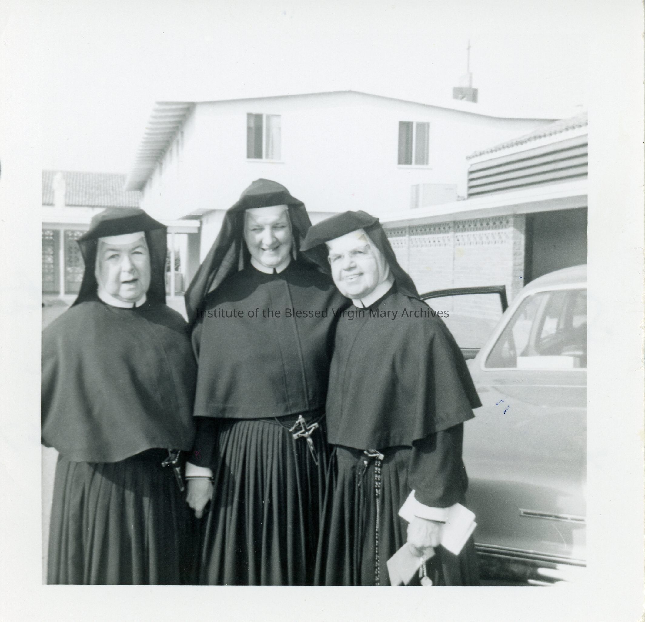 St. Philomene's Convent located at 2320 El Camino Avenue in Sacramento, California. From left to right are Sister Margaret (St. William) Gormaly, Sister Patricia (Anastasia) O'Connor and Sister Mary (Roberta) Gormaly.