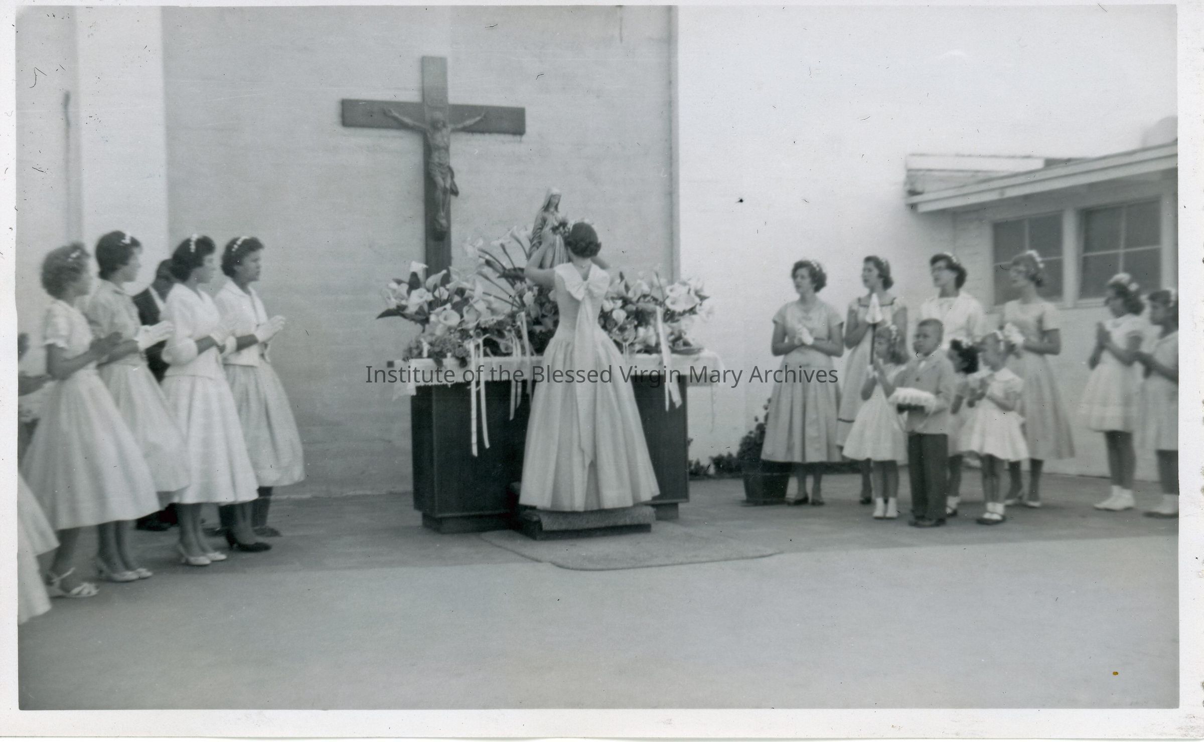 St. Philomene's School located at 2320 El Camino Avenue in Sacramento, California. This image features students participating in a May Crowning ceremony.