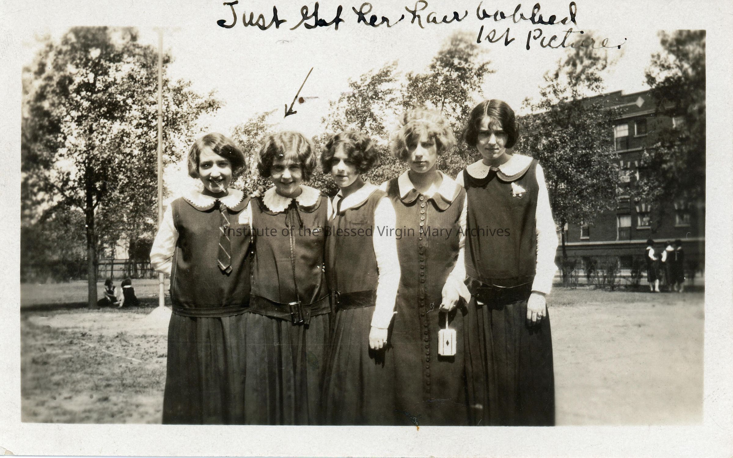 Students at Loretto Academy Woodlawn. A note at the top states "Just got her hair bobbed, 1st picture".