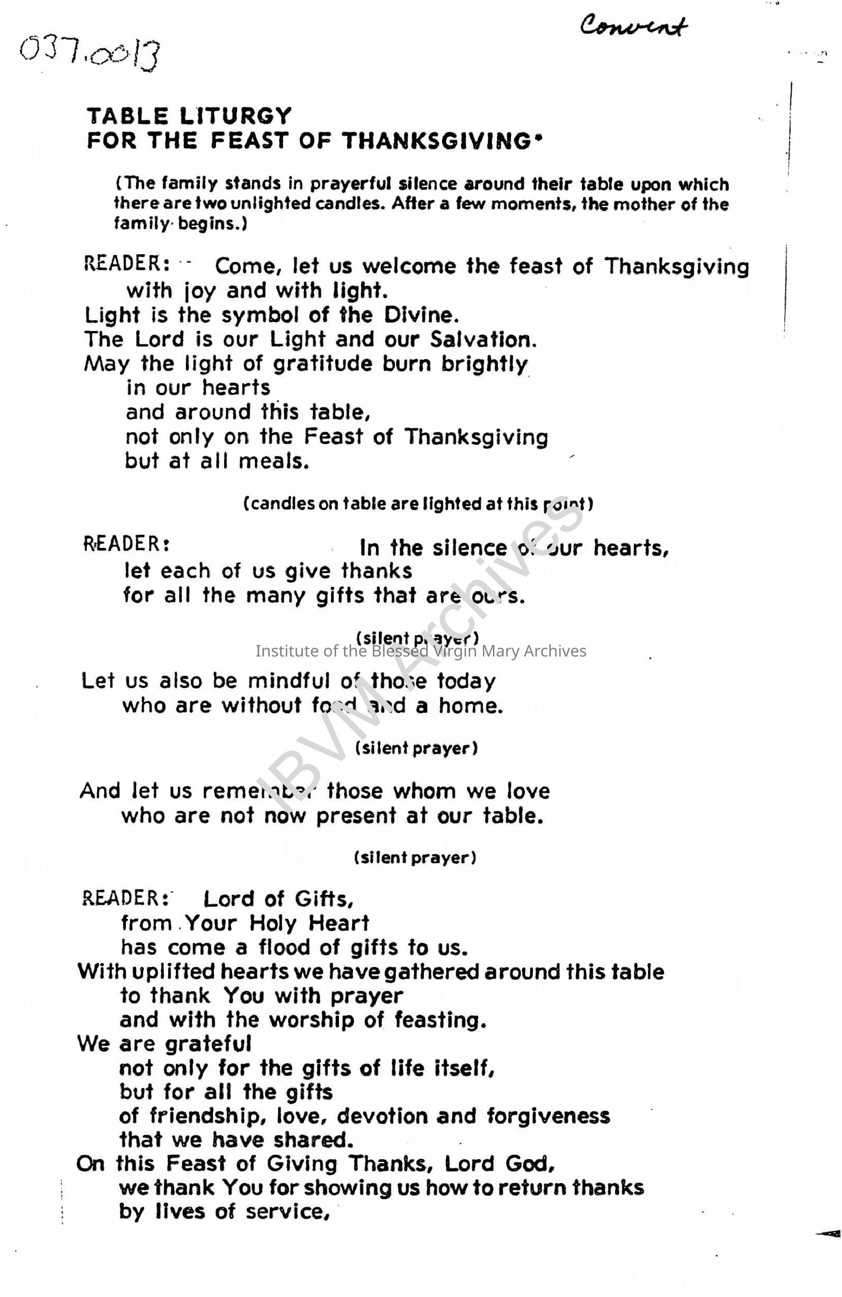 Readings and prayers for the Feast of Thanksgiving held at the St. Philomene's Convent in Sacramento, California.