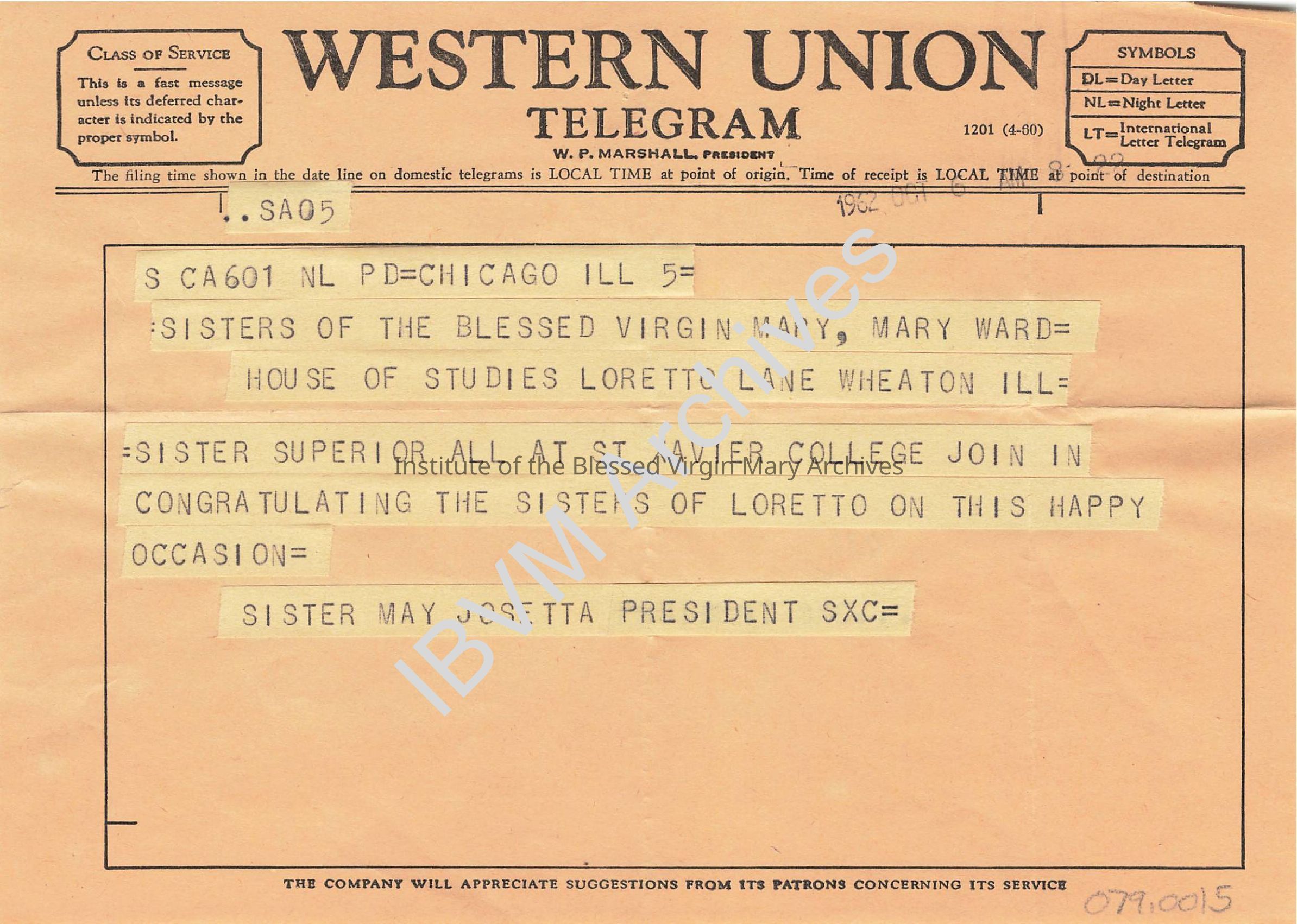 Congratulatory Western Union Telegram from Sister Mary Josetta Butler, RSM, President of St. Xavier College. It discusses the cornerstone blessing ceremony for the Mary Ward House of Studies. Completed in 1964, the building was located adjacent to the Loretto Convent and Chapel in Wheaton.