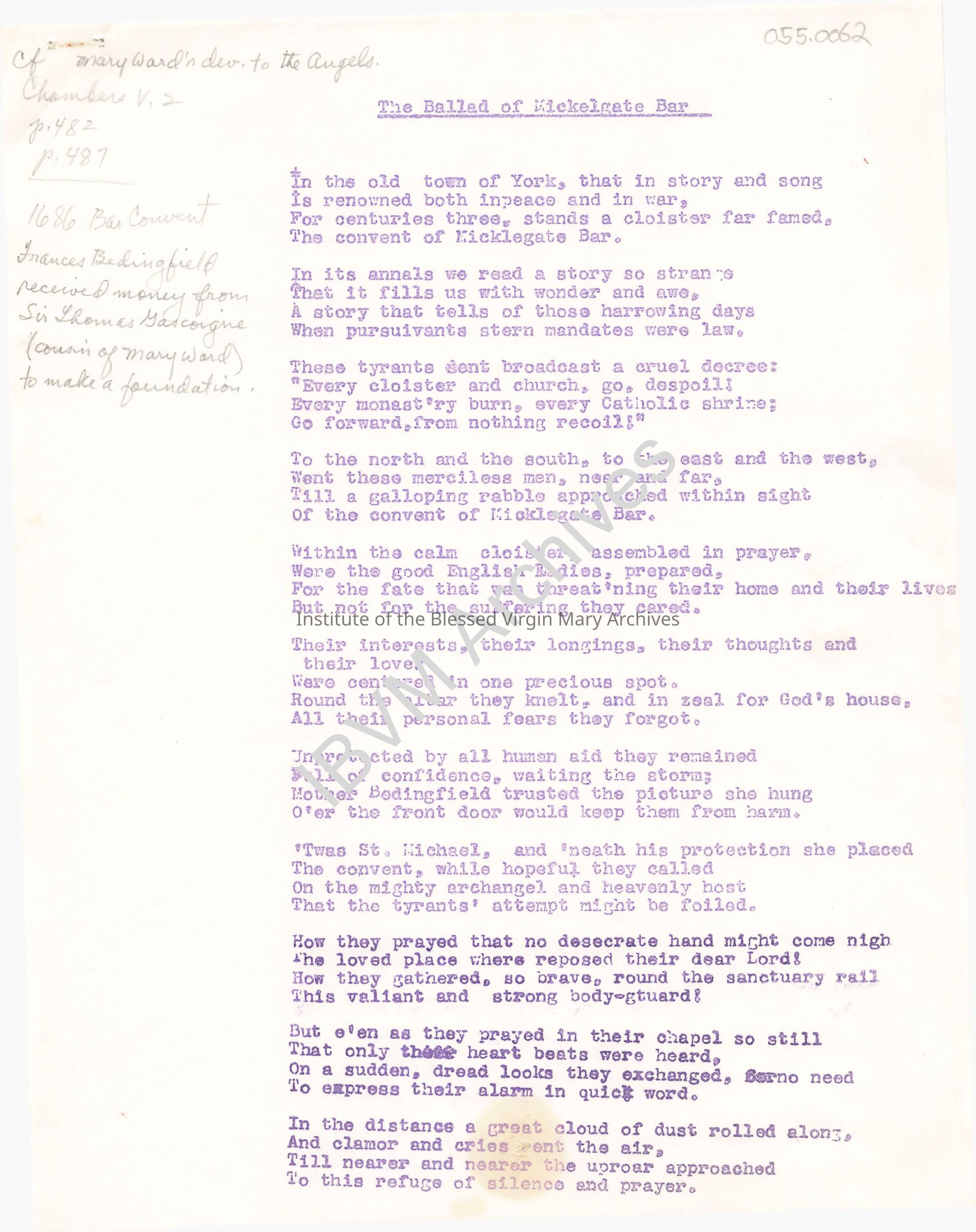 Poem written by Mother Dorothea Barry titled "The Ballad of Micklegate Bar". It tells the story of an IBVM Convent in York, England, and of an event in 1696 when an angry mob attacked the house. The convent itself was constructed in 1686 and was inspired, in part, by Sir Thomas Gascoigne.Context