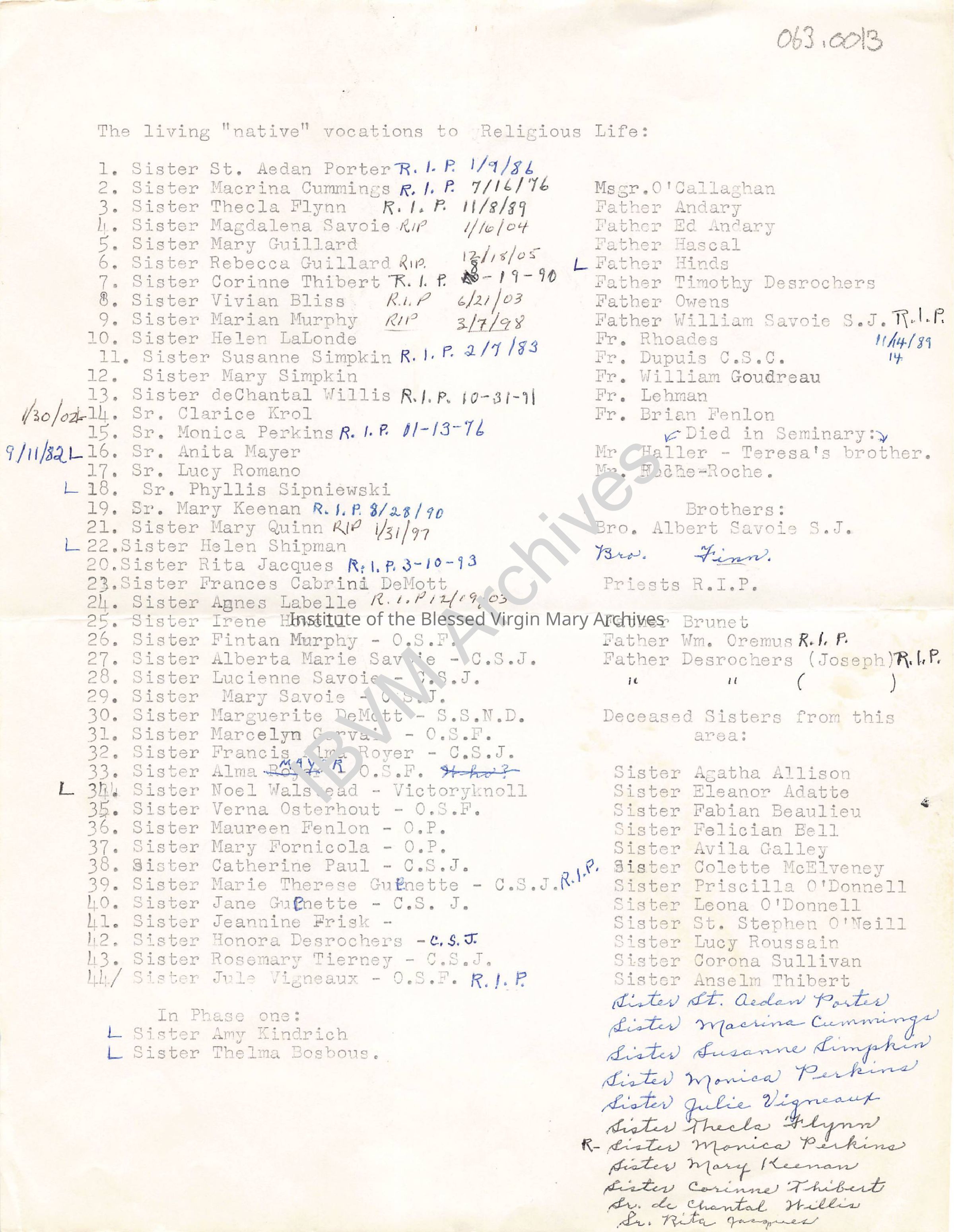 The Living “Native” Vocations to Religious Life. The list features men and women religious from the area of Sault Ste. Marie, Michigan, including a number of IBVM Sisters. Names and some dates of death are provided.