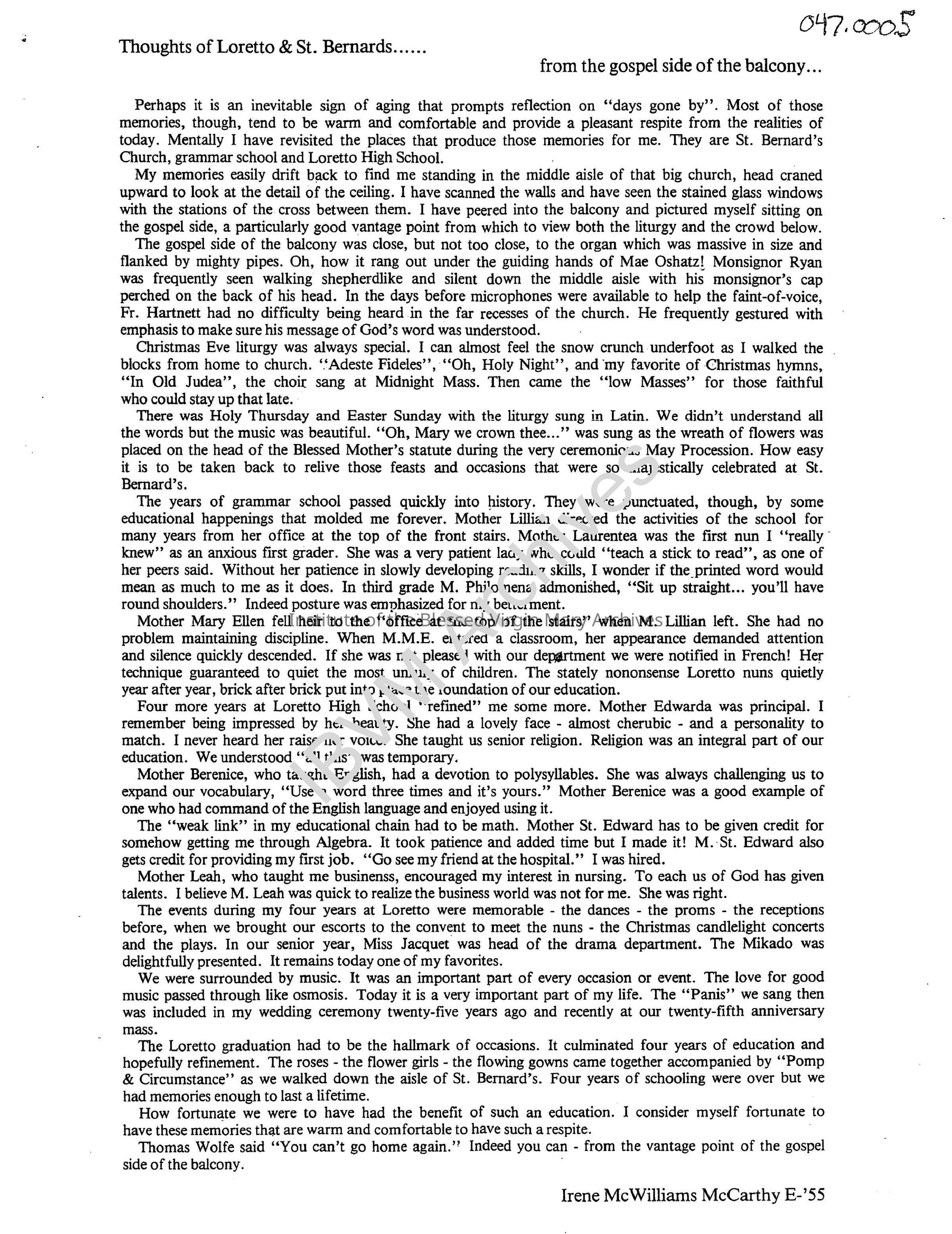 Thoughts on Loretto and St. Bernard recorded by Irene McWilliams McCarthy, a Loretto High School graduate of 1955. Topics include holidays, Mass, Mother Lillian, Mother Mary Ellen, Mother St. Edward, Mother Leah, subjects, music and more.