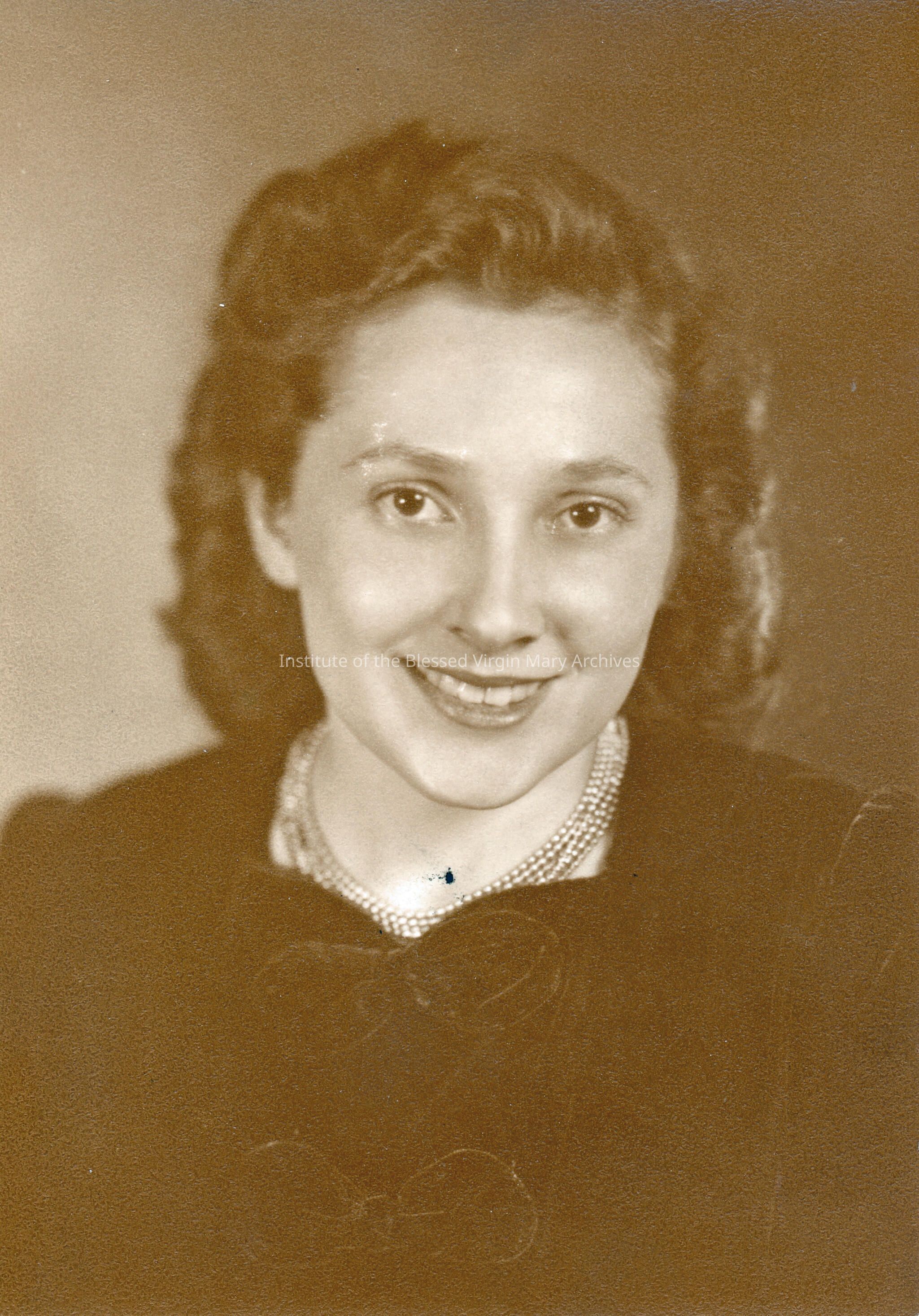 Portrait of Veronica Rains, a 1938 graduate of Loretto Academy in Sault Ste. Marie. Founded in 1896, the academy's location at 377 Armory Place opened in 1899 and underwent a substantial addition in 1910. Converted into a co-ed high school in 1944, it was demolished in 1966 after Loretto Catholic Central High School was constructed.