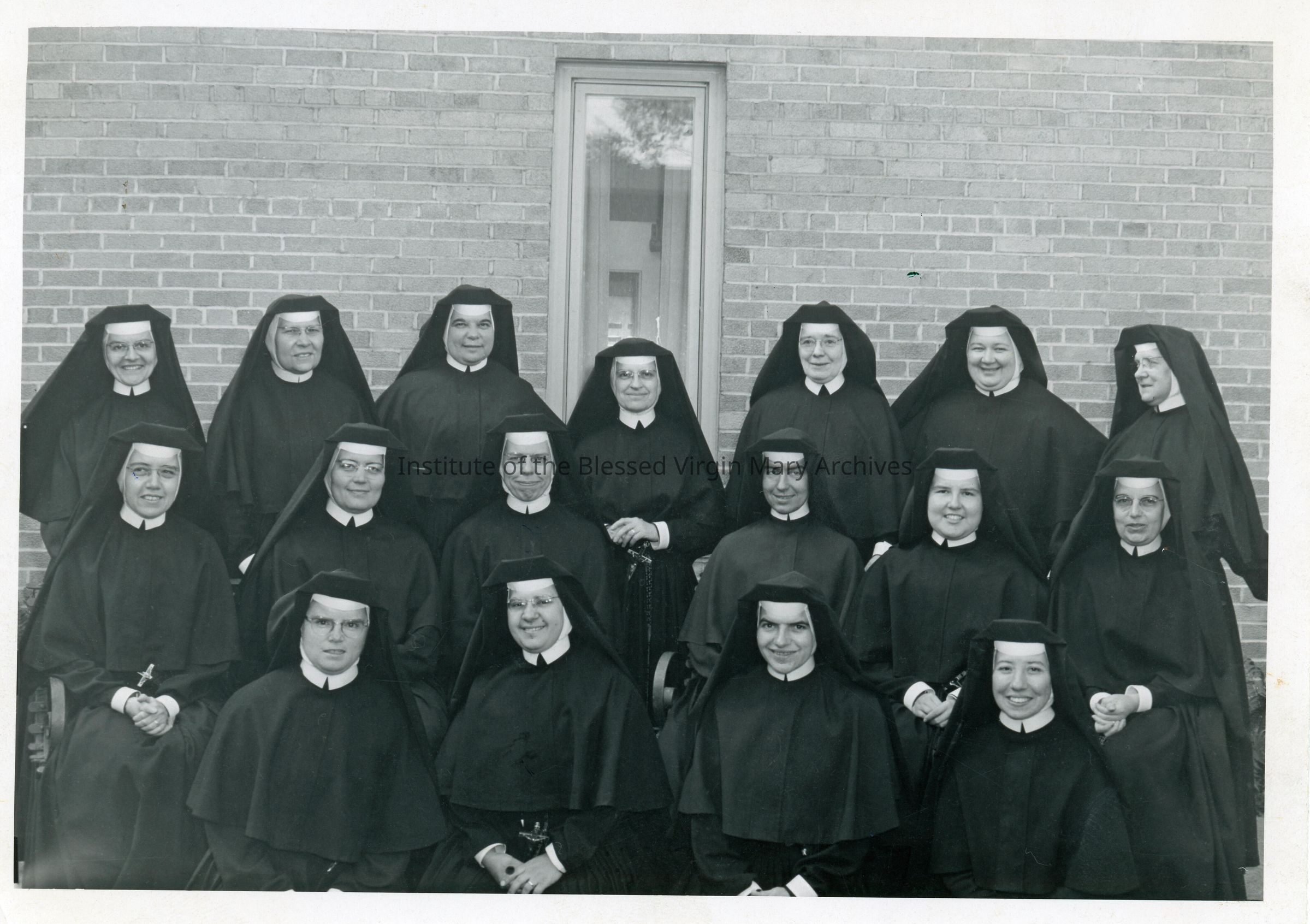 Sisters from the Sault gathered near Loretto Convent located at 377 Maple Street in Sault Ste. Marie, Michigan. In the top row, from left to right, are Sister Rita (St. David) Jacques, Sister Mary (St. Aedan) Porter, Sister Marion (de Chantal) Willis, Sister Agnes (Catalda) Labelle, Sister Kathleen (Leona) O'Donnell, Sister Corona Sullivan and Sister Ruby (Eleanor) Adatte. In the Second row, from left to right, are Sister Irene (Pierre) Howell, Sister Suzanna (Magdalena) Savoie, Sister Helen (St. Norbert) LaLonde, Sister Clarice Krol, Sister Helen (Cyrille) Shipman and Sister Margaret (Susanne) Simpkin. In the bottom row, from left to right, are Sister Mary (St. Patrick) Simpkin, Sister Lucy (Philip) Romano, Sister Mary (St. Alfred) Guillard and Sister Merel (Frances Cabrini) DeMott. Completed in 1956, the building remained with the IBVM until 1985. Previously, the convent was housed in Loretto Academy at 377 Armory Place.