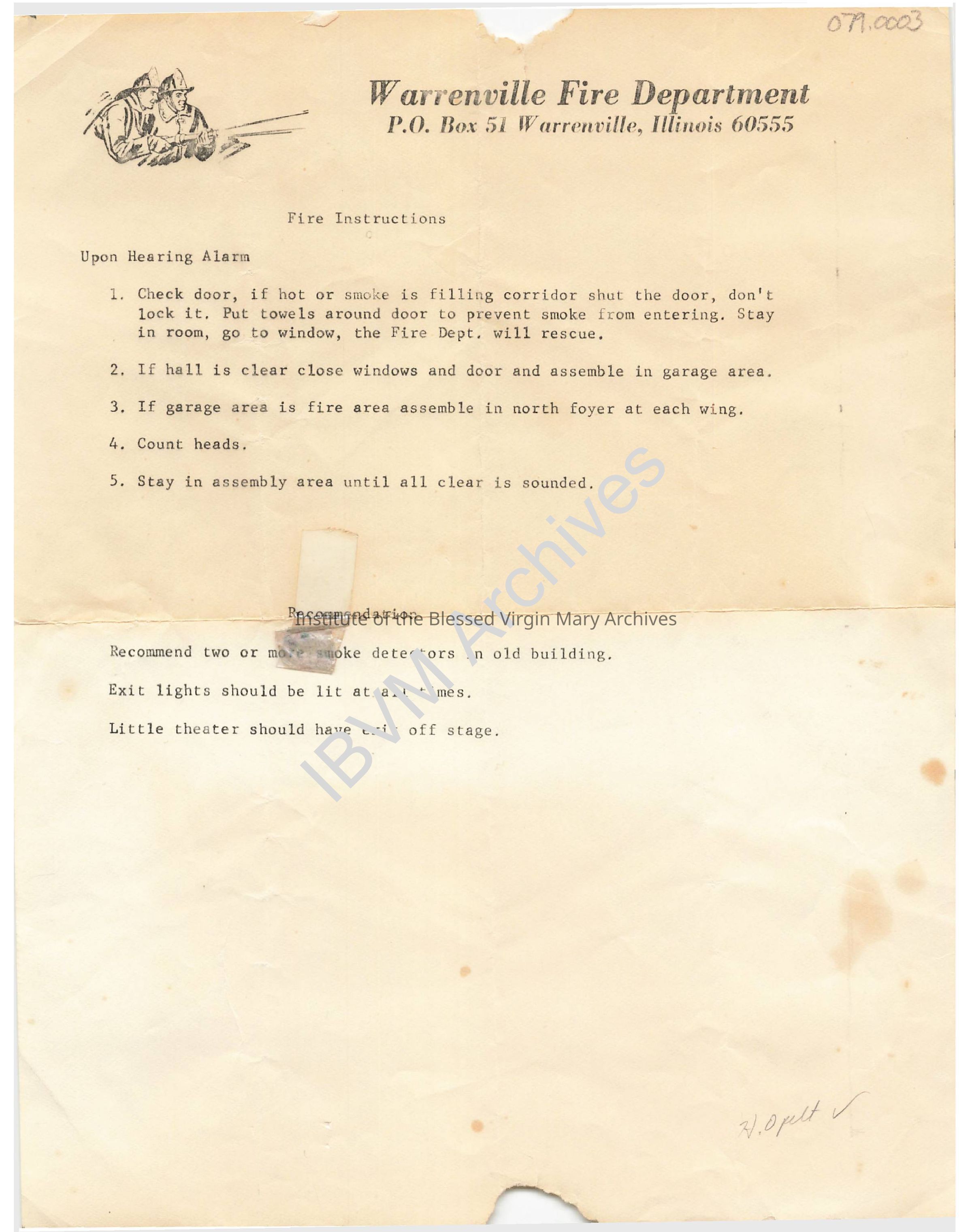 Letter from the Warrenville Fire Department containing instructions and recommendations for the Loretto Convent in Wheaton.