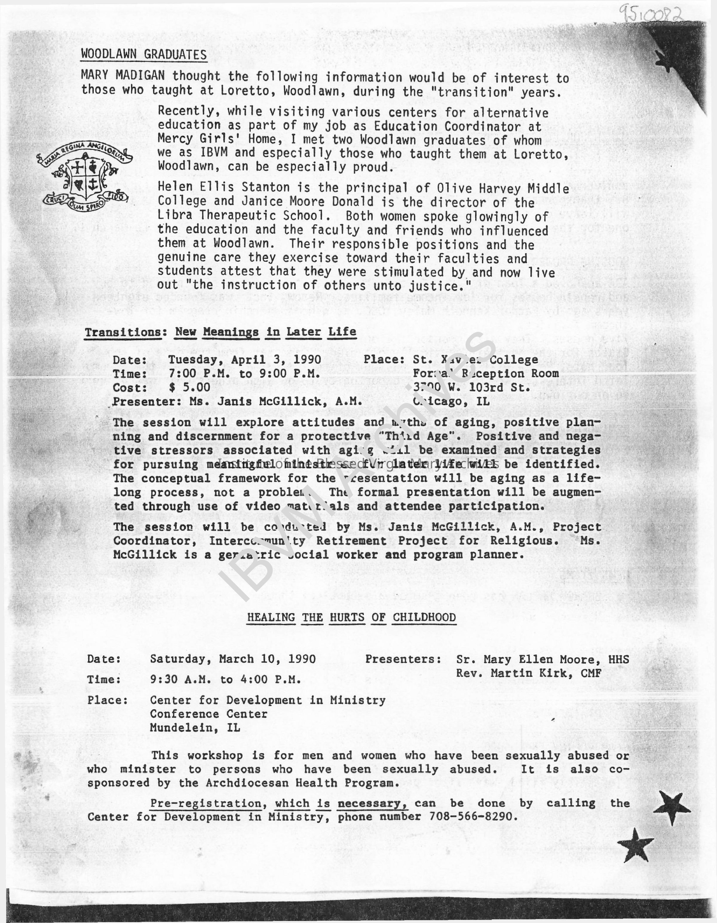 In 1905, the IBVM Sisters were invited to build a school in the Chicago community of Woodlawn. Located at 1447 East 65th Street, Loretto Academy formally opened in August of 1906 and operated until 1972. Following its closure, the school merged with Mercy High School to form Unity High School. Later, the building was sold to The Woodlawn Community Development Corporation and served in various capacities.Context
