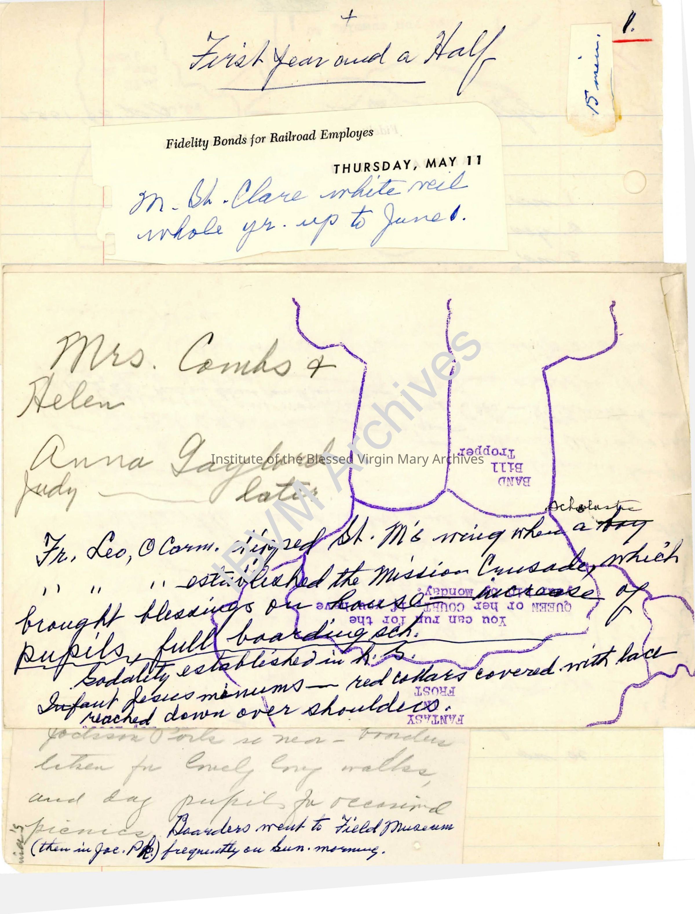 Collection of handwritten notes and documents related to the history of Loretto Academy Woodlawn. They are only partially organized and section titles include: The First Year and a Half, Purchase of the Land, The First Sod, First Mass, Early Benefactors, Amusing Incidents, Carmelites, Opening of School, Cellar, Finances, Persons, Promises, Retreats, Graduations, Later Years, The Fence, American Novitiate, Silver Jubilee, Golden Jubilee, Much Later Years, Picnics, Summer Homes and Pupils.