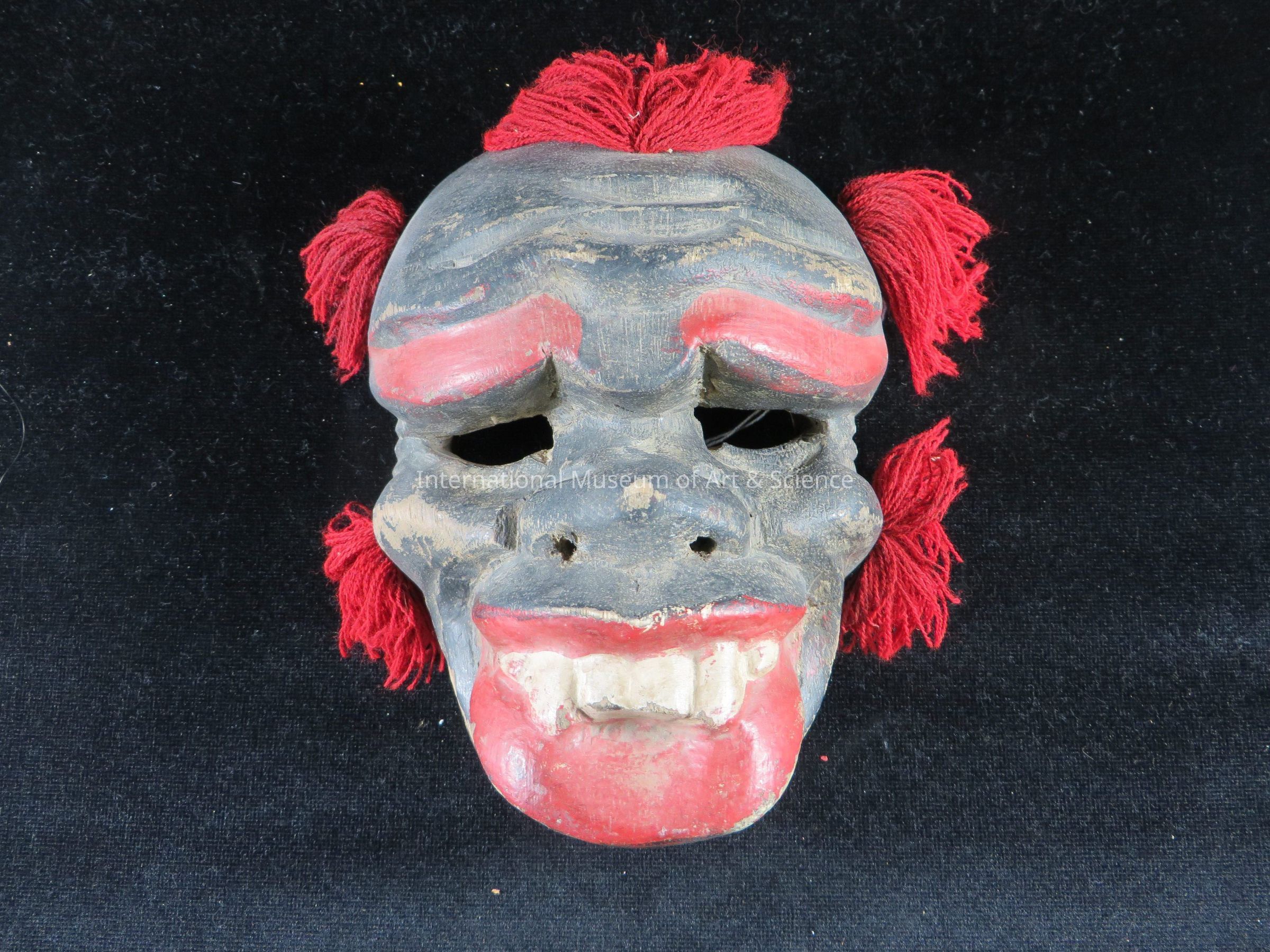(Negrito) mask. Black face; openings at eyes and nostrils; predominant red eyebrows and mouth; carved teeth painted white; red yarn attached at forehead, temples and cheeks.Dimensions