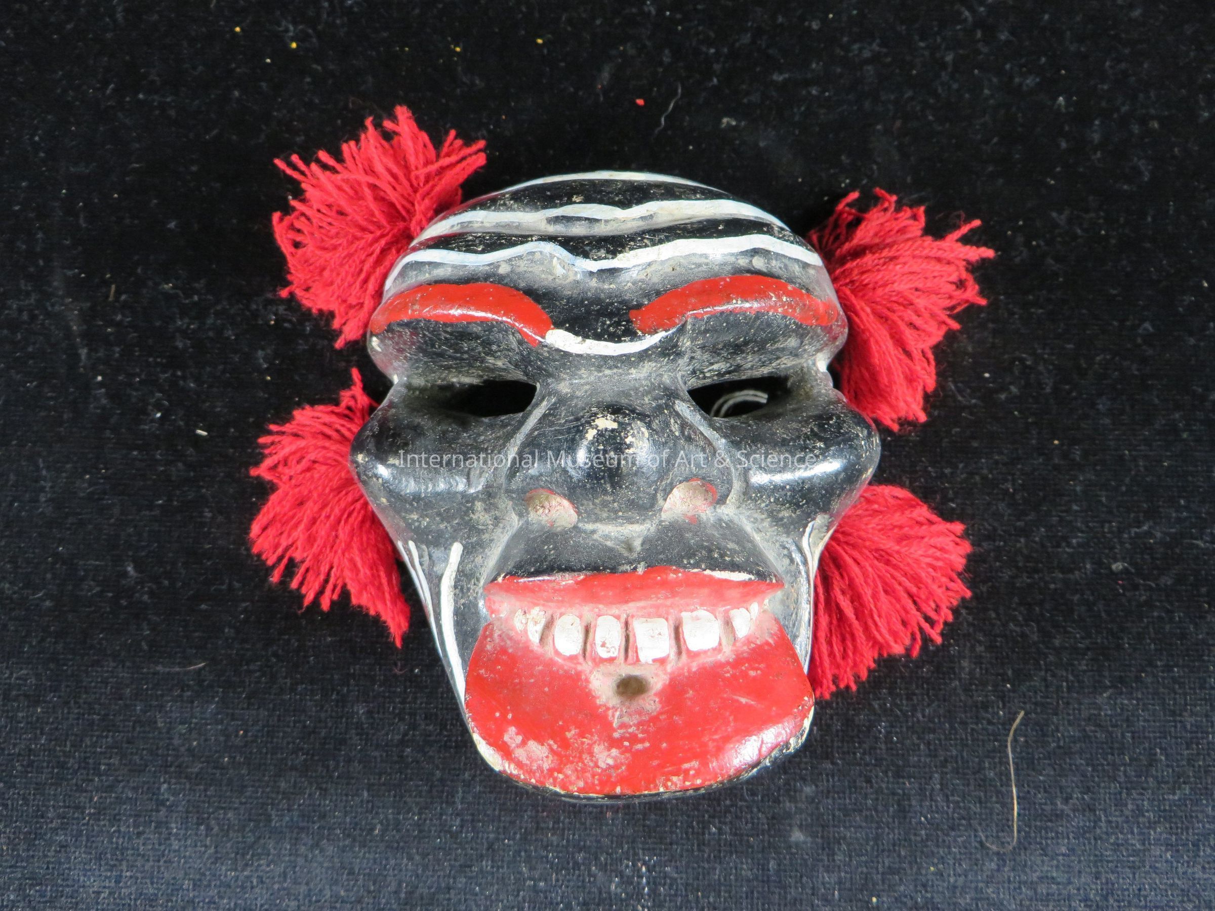 (Negrito) mask. Black face; red eyebrows; large protruding lower lip, white stripes, red yarn; holes carved for eyes.Dimensions