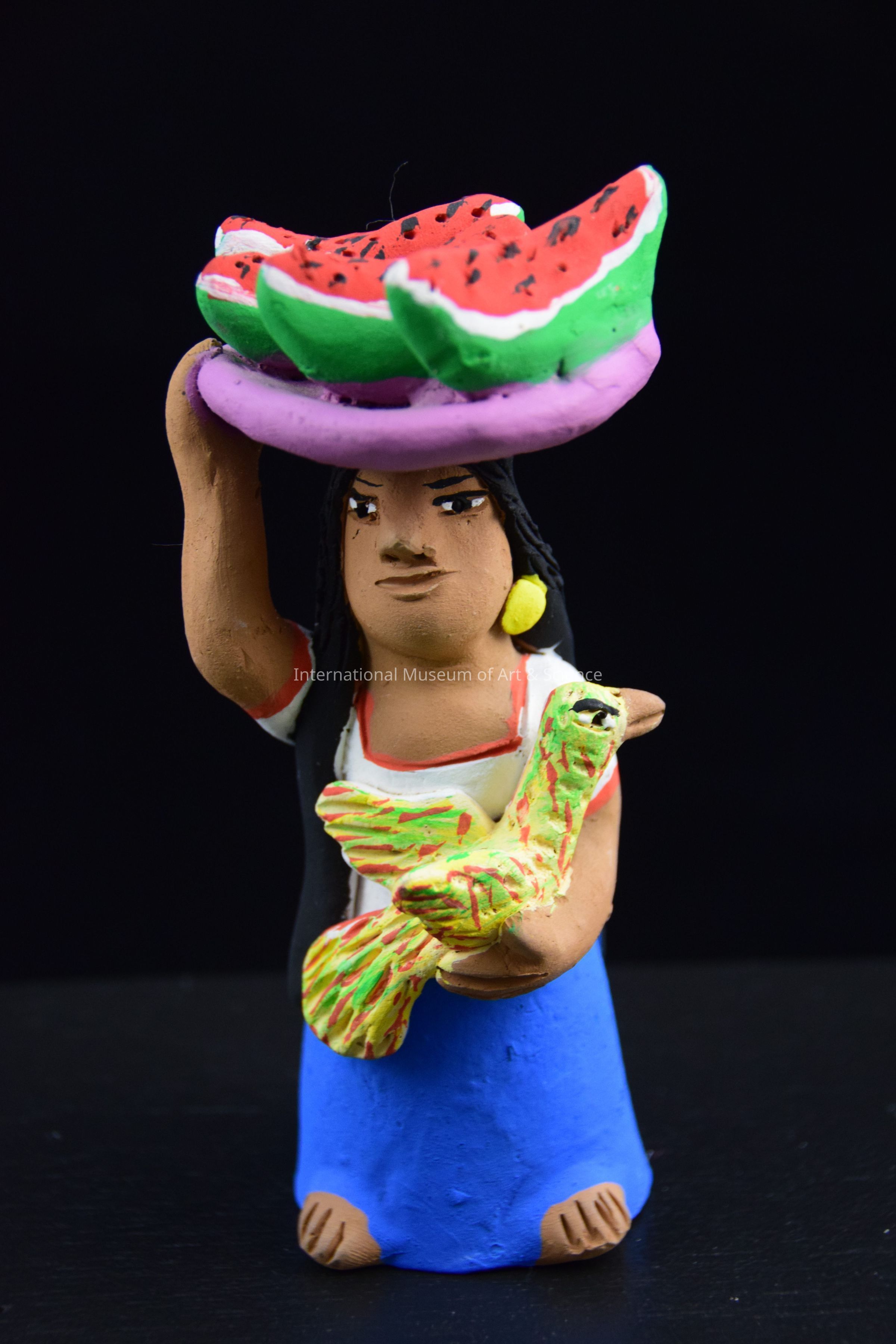 A ceramic figurine of a woman wearing a white blouse with orange trim and a blue skirt. She is carrying a large lilac colored platter filled with cut watermelon on her head. She also holding a yellow bird under her left arm.Dimensions