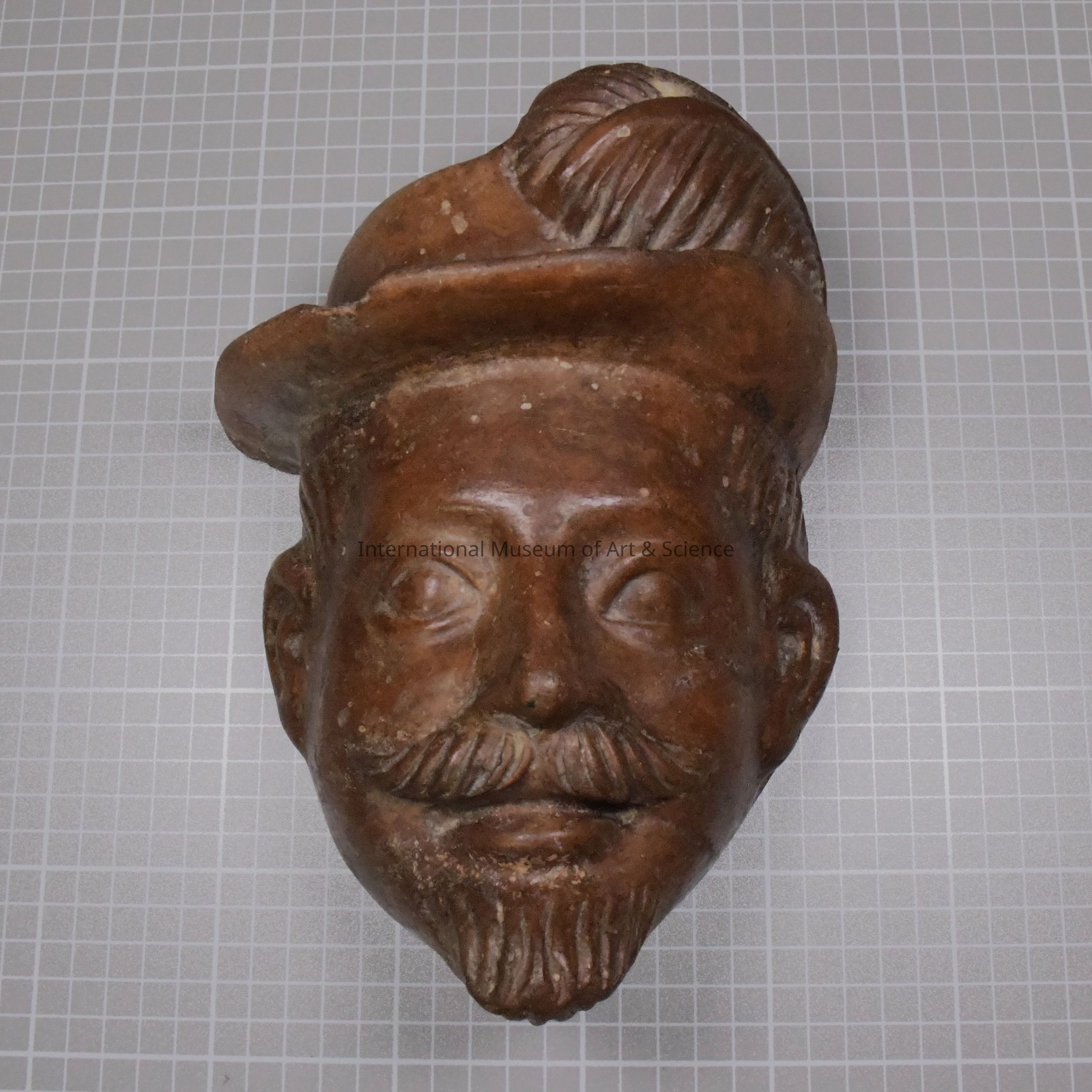 Ceramic mask mold of a man with well groomed facial hair wearing a feathered hatEthnography