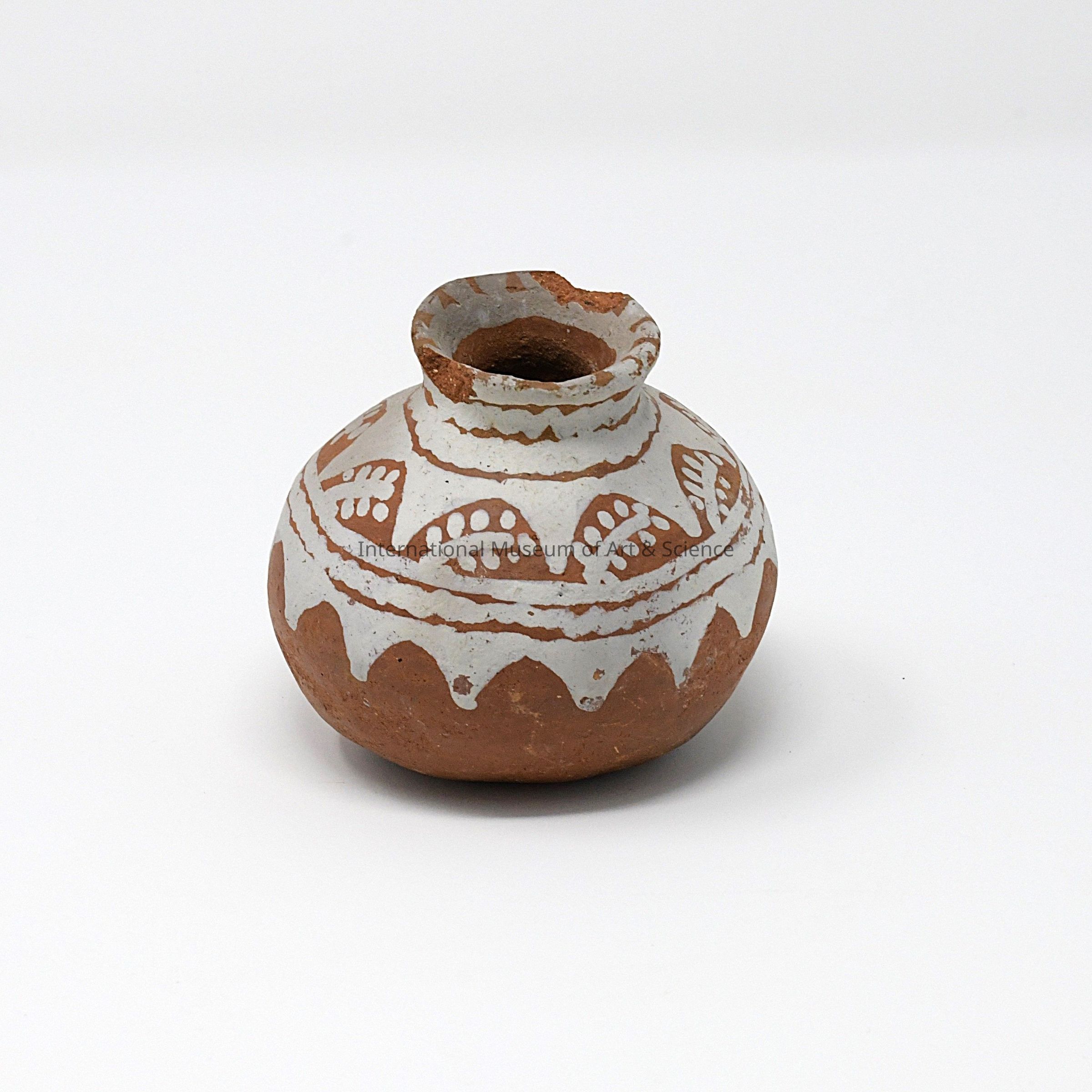 Small, round-bodied ceramic vessel with a short, narrow neck and slightly everted rim. Made of reddish-brown earthenware and coated on the upper half with a white paint, the vessel is decorated with hand-painted motifs in negative resist, revealing the natural clay color beneath. The design consists of repeating leaf-like patterns and scalloped borders encircling the vessel’s shoulder and base of the neck. The rim shows several chips, revealing the natural clay body. The underside is unglazed and undecorated, with visible shaping marks.Ethnography