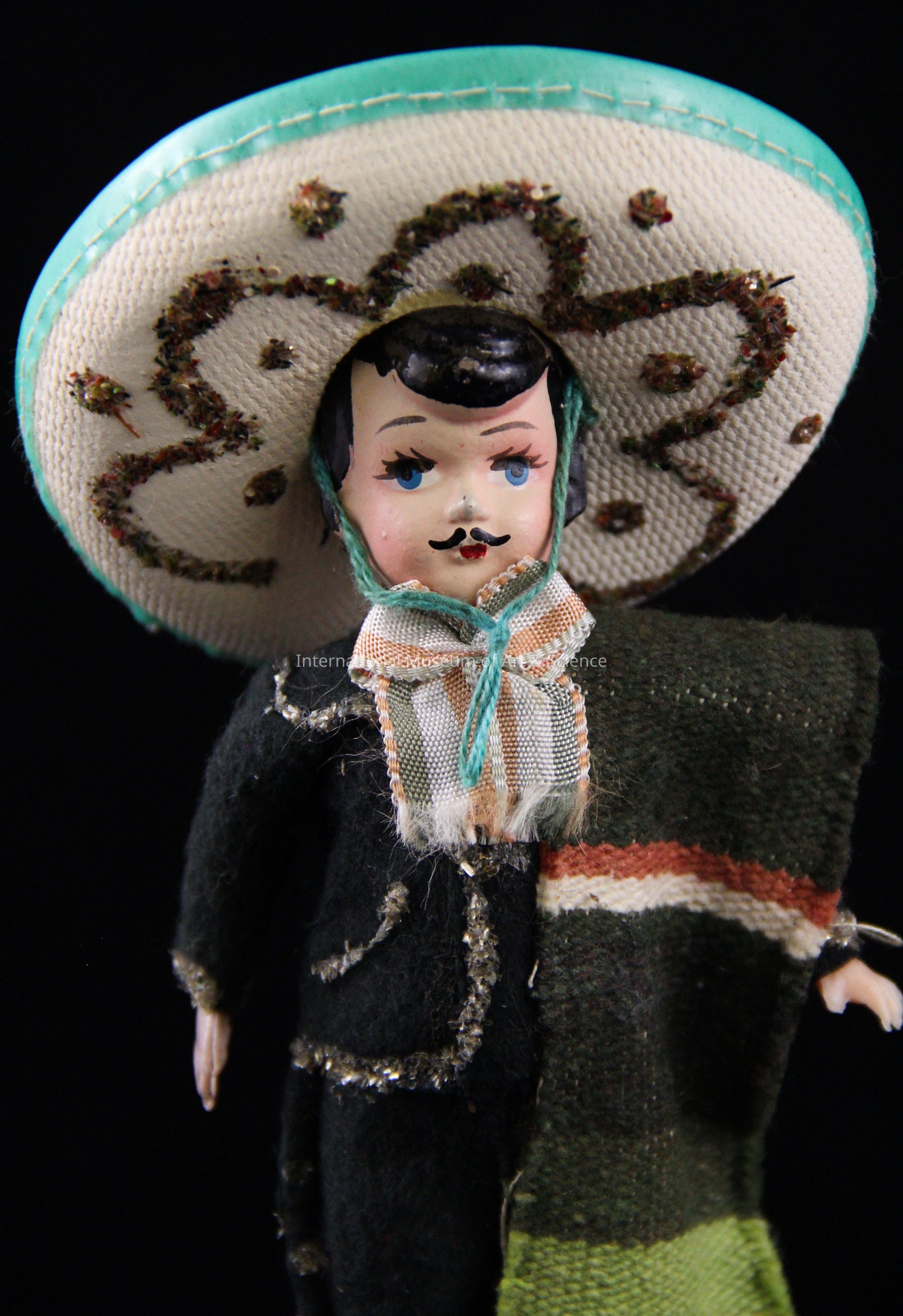 A male doll in ethnic dress. The doll has on a large white sombrero with green trim around outer edge, a glitter design under brim, and a green string to tie under chin. The doll is wearing a black felt shirt and trousers (one piece) trimmed with silver glitter, and green, orange, and white striped ribbon tied in bow at neck, and a green, yellow, brown, and white striped serape over one shoulder. The doll has black painted shoes. The doll has movable arms.Artwork Details