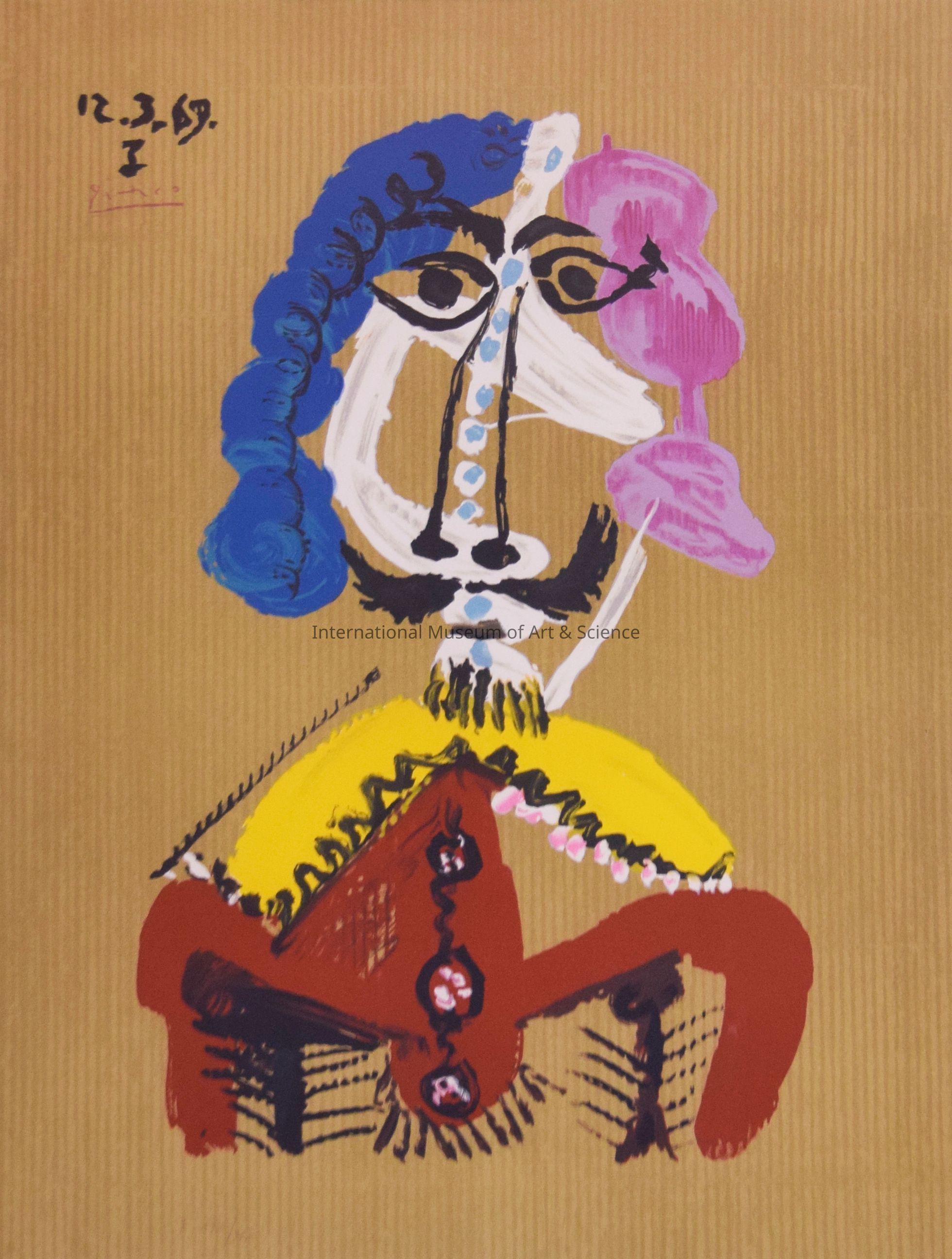 A lithograph print from the series of Imaginary Portraits, by Pablo Picasso, printed by Marcel Salinas. Distributed by Abrams Editions, New York. Signed Picasso in plate, upper left. Edition A177/250, embossed. The figure has blue & purple hair, a gold collar, and rust colored clothing.Artwork Details