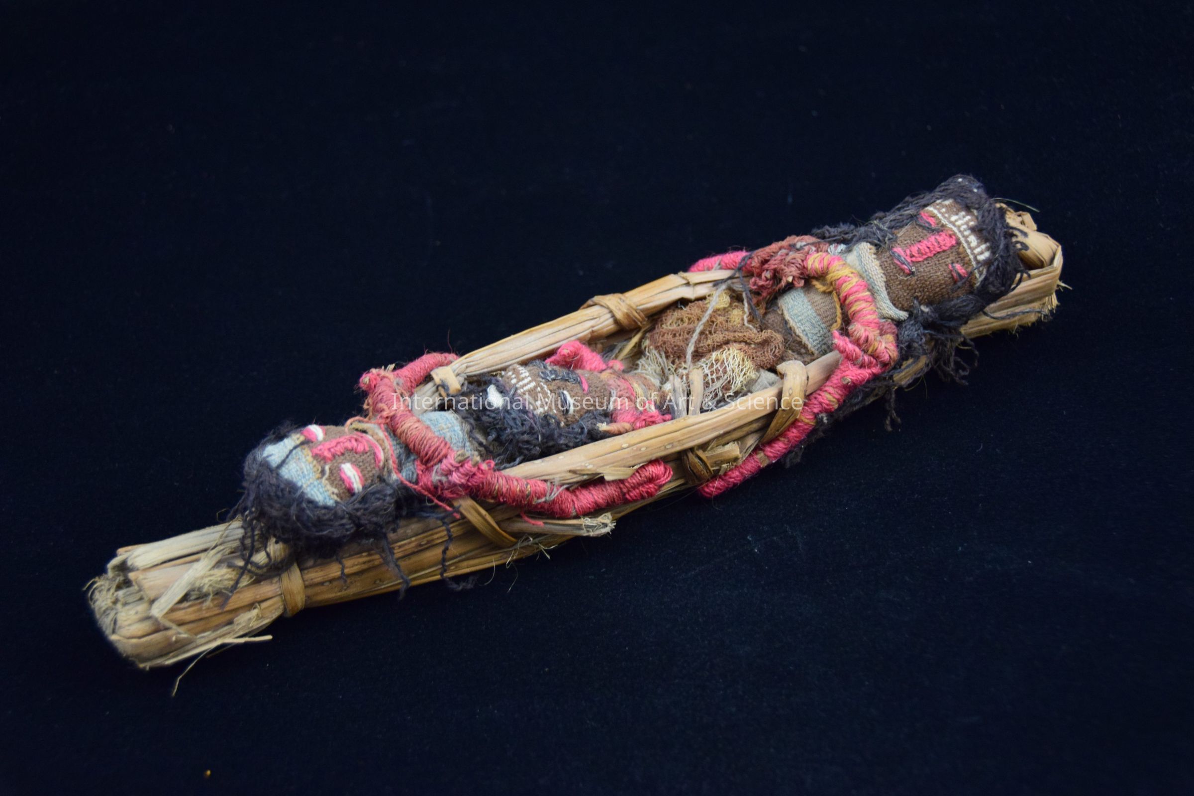 A miniature Peruvian reed soul boat. The small boat is made from reeds and has three figures laying inside. The figures are crafted from woven textile pieces and string. The dolls are made in the Chancay style of burial dolls. The Chancay people lived in Peru from 1000 -1470 AD. This group of figures seems to be a modern reproduction.Artwork Details