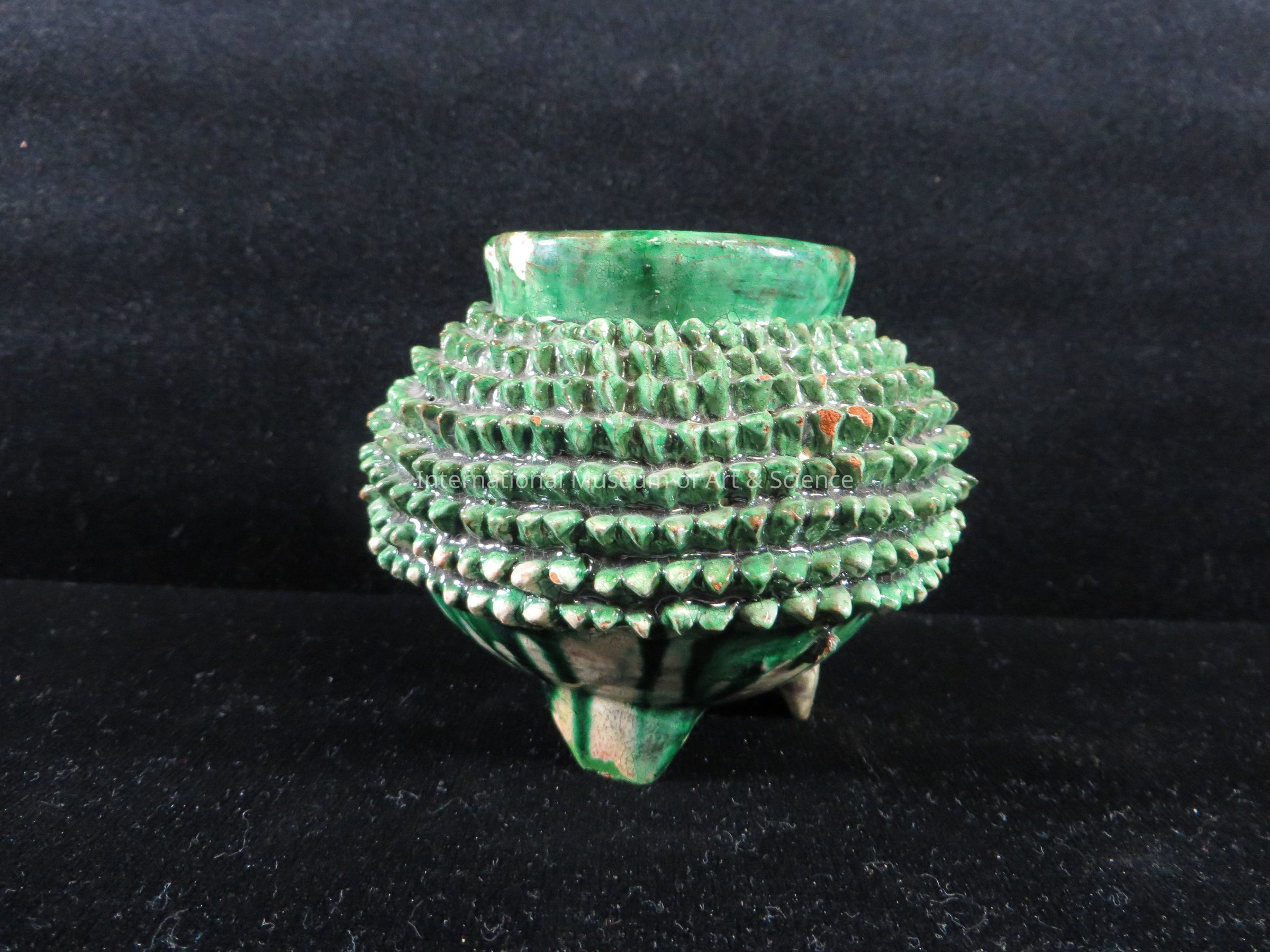 Tripod ceramic jar with green glaze, encircled with miniature spikes from 4 1/2" Diameter; 4" T
