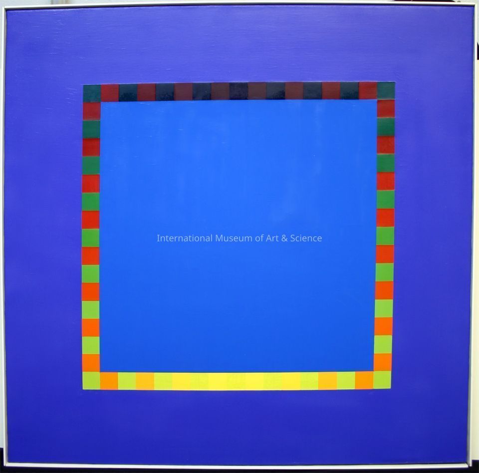 "1973 #5". Multi-colored hard-edged with blends, background with smalt blue, large central squre of cerulean blue; central square outlined by numerous small blocks; top portion has red and green blocks blending together into dark dull colors; bottom portion has light green and orange blocks blending into bright yellow blocks; left and right sides has red and green blocks blending into orange, green blocks;Artwork Details